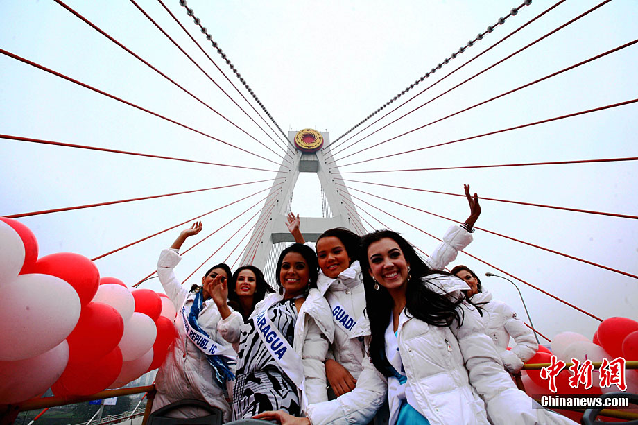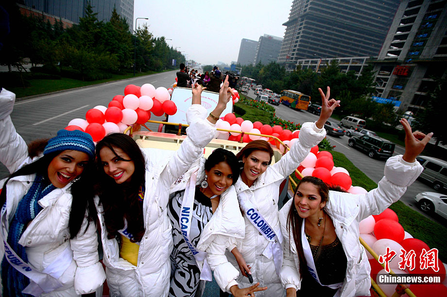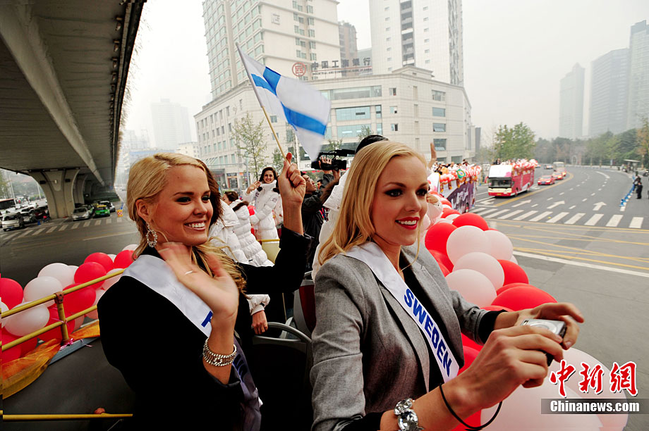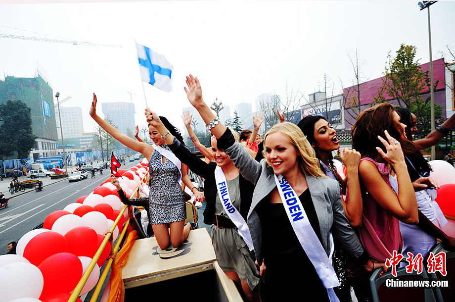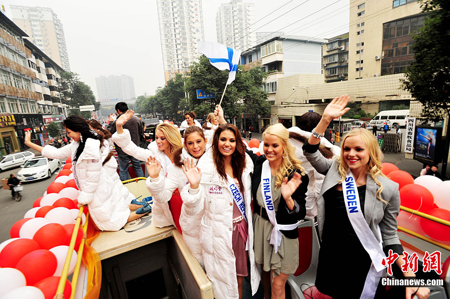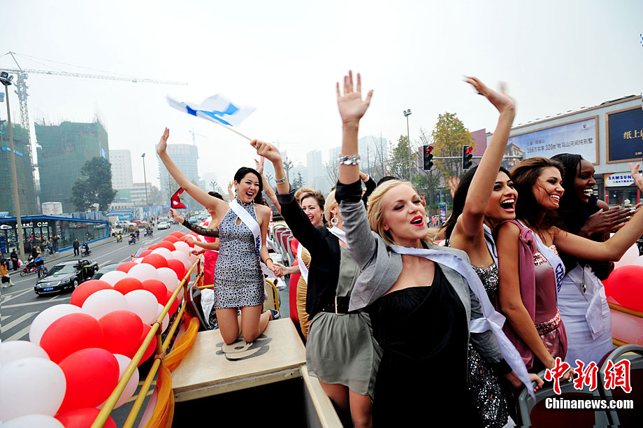 10月31日,国际小姐世界大会全球总决赛的70位参赛佳丽花车巡游成都市区。中新社发 安源 摄