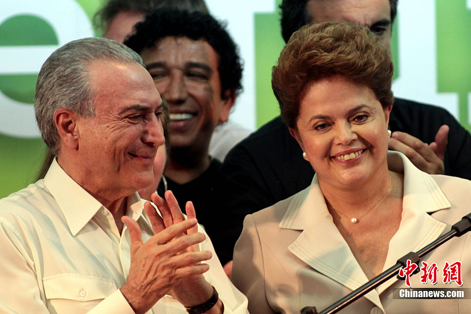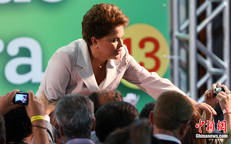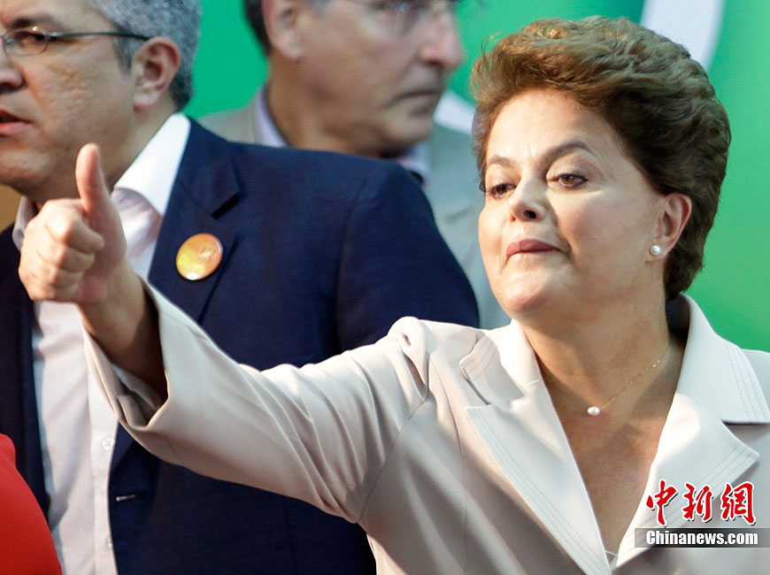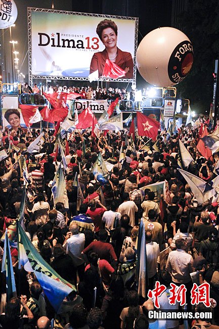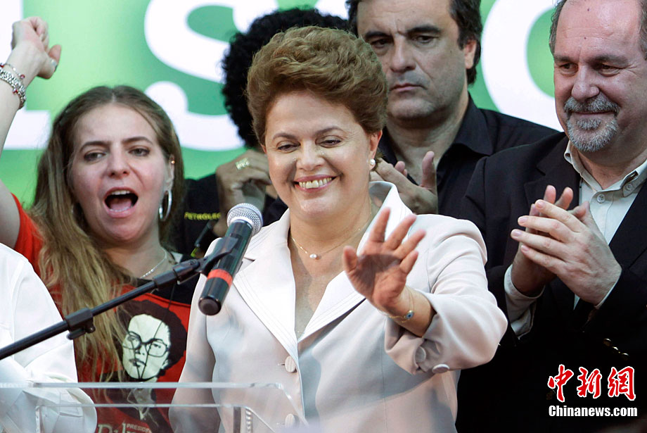巴西当地时间10月31日选出该国首位女总统,当天巴西最高选举法院宣布,根据已统计完的95%的选票,劳工党候选人迪尔玛·罗塞夫在第二轮投票中胜出,当选总统。现年62岁的罗塞夫获得55%的选票,击败了唯一的竞争对手前圣保罗州州长、社会民主党候选人若泽·塞拉。图为10月31日,劳工党候选人迪尔玛·罗塞夫在巴西利亚举办获胜演说。