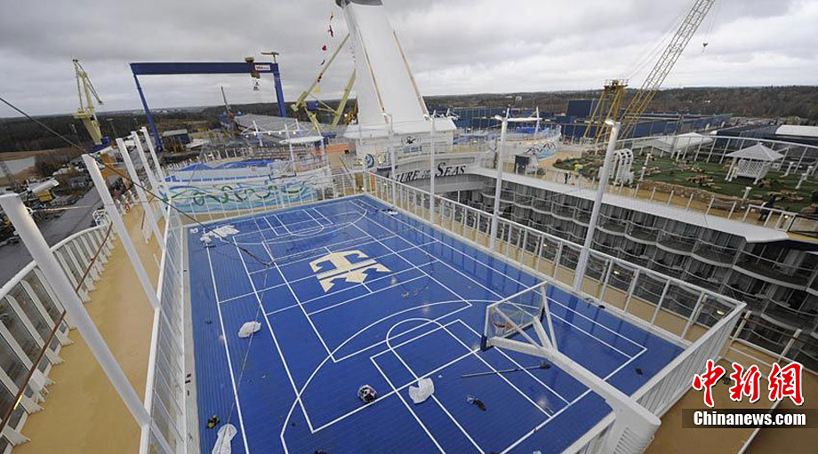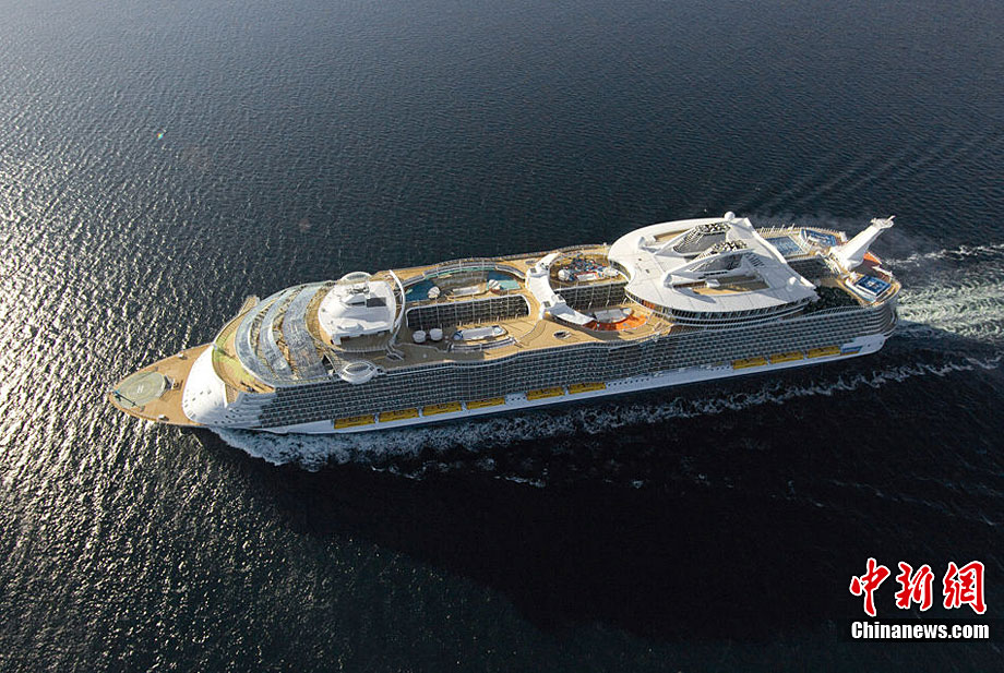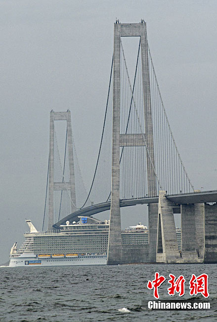 近日,世界最大邮轮“海洋魅力号”于芬兰图尔库船厂完工,并将于2010年12月进行首航。这艘堪称海上奇观的豪华邮轮长361米、宽66米,水面高72米,排水量达22.5万吨,共有16层甲板和2704个客舱,可搭载6360名游客和2100名船员。尚未经受大风大浪考验的海洋魅力号在从造船厂前往美国佛罗里达州的过程中顺利通过了丹麦一座距离船顶4厘米的大桥。