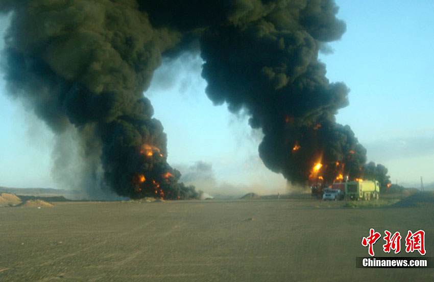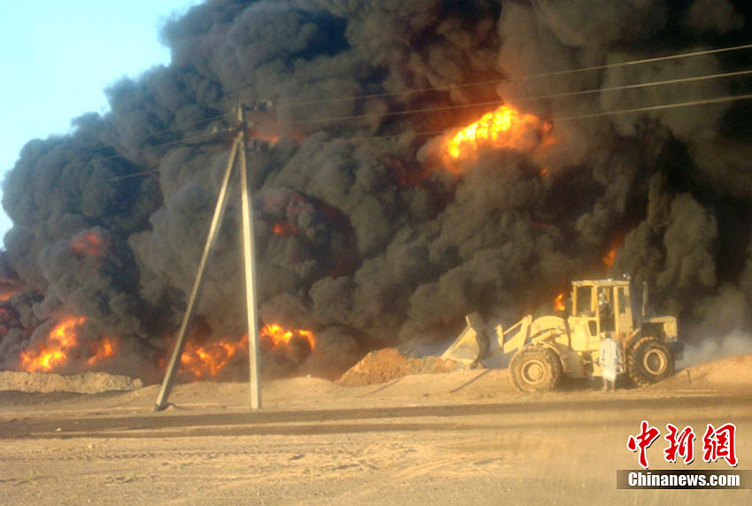 当地时间11月2日,在也门南部省份舍卜沃,输油管道被炸后燃烧升起浓烟。也门安全官员当日说,“基地”组织武装人员当天炸毁了也门南部舍卜瓦省一条主要输油管道,但未导致人员伤亡。