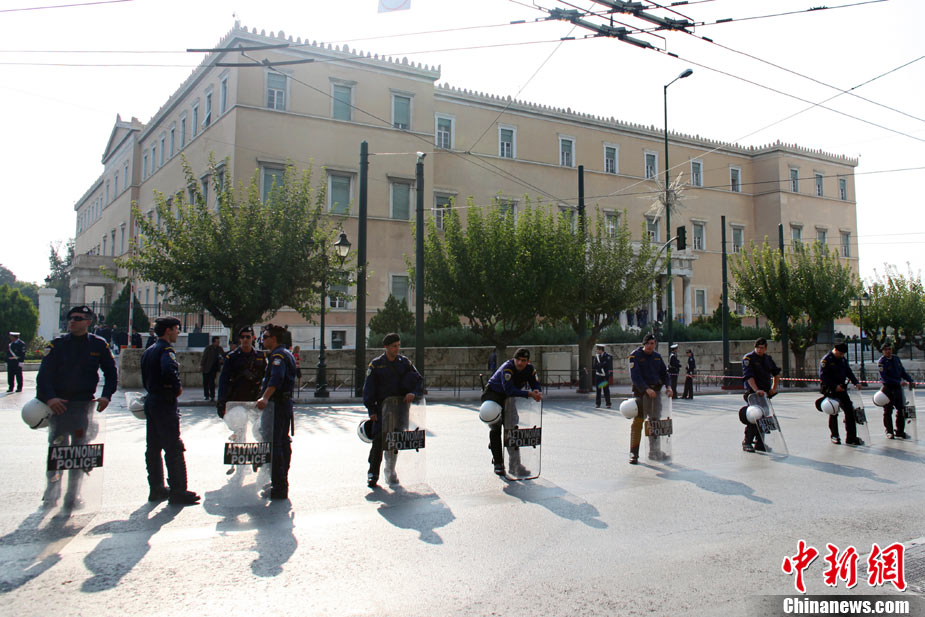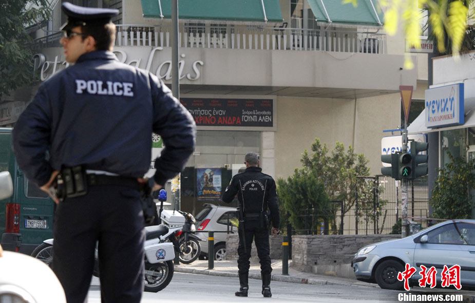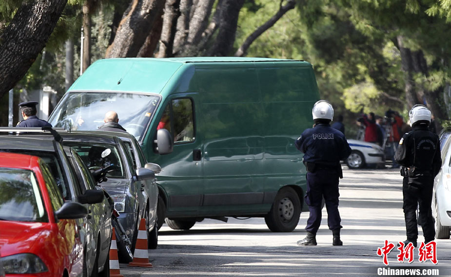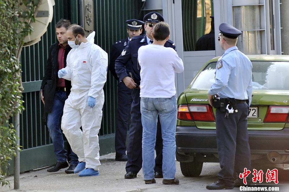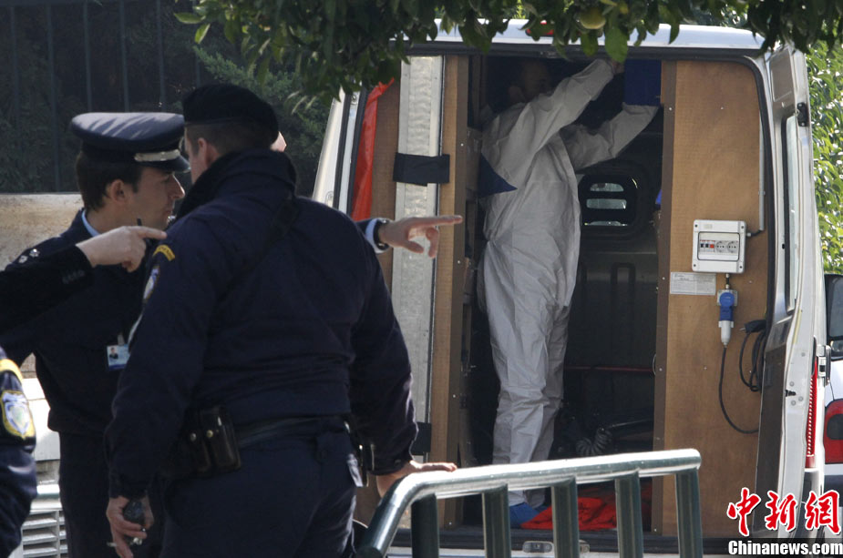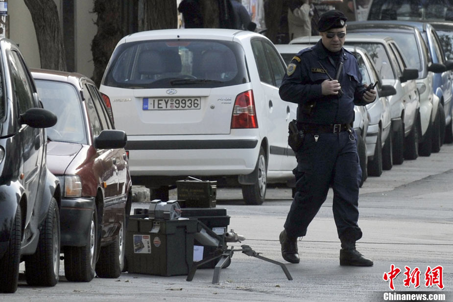 希腊首都雅典2日共发生5次小型爆炸事件,但没有造成人员伤亡。瑞士、俄罗斯等国驻希腊大使馆2日先后发生爆炸,另外希腊警方在议会、保加利亚使馆与一家旅游公司门前分别引爆了3枚邮包炸弹。图为在俄罗斯使馆门前防爆人员在处理现场。