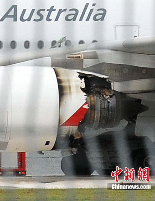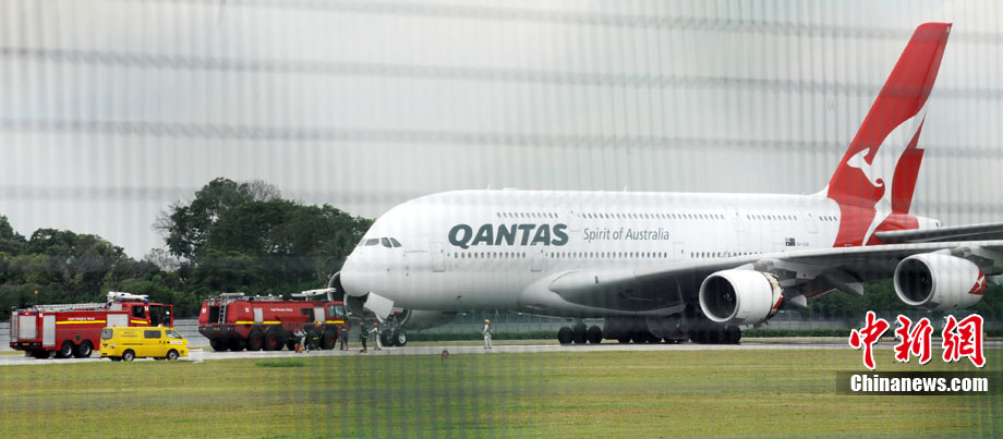11月4日,澳大利亚航空公司否认该公司一架飞机坠毁的消息,称该架飞机是引擎出现故障,已经在新加坡机场紧急降落。据悉,澳大利亚航空公司一架航班号为QF32的空客A380客机引擎出现故障,被迫关闭了4个引擎中的1个,于当地时间4日中午12时左右在新加坡机场实施降落。图为发生故障的澳航客机停在新加坡机场。