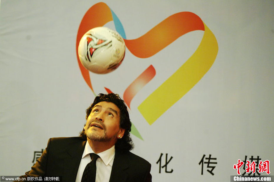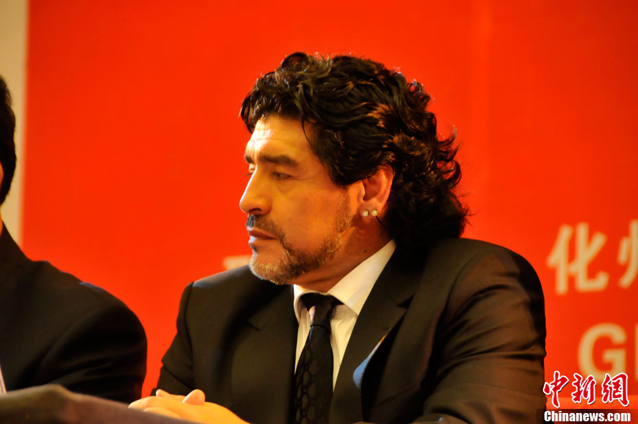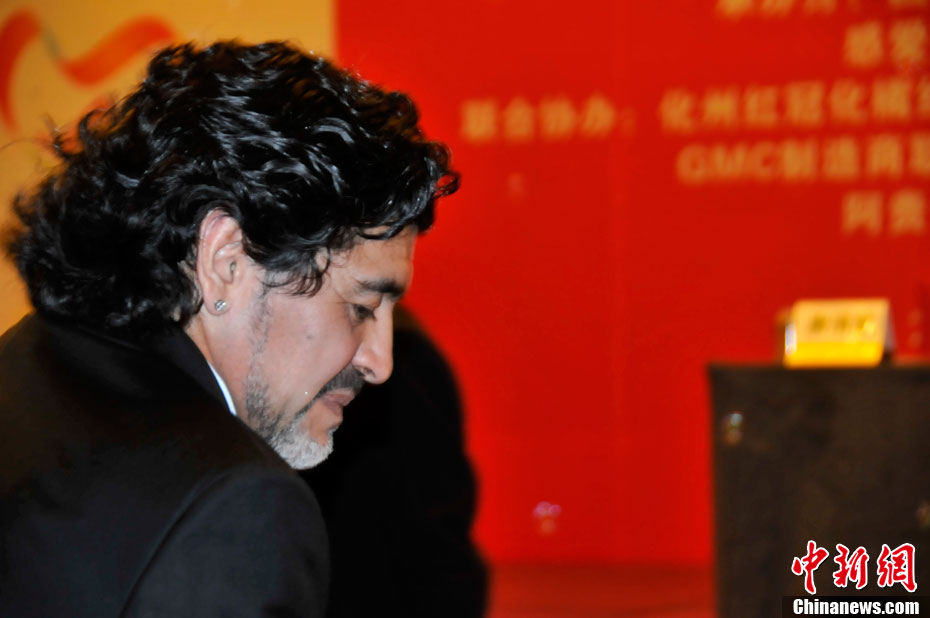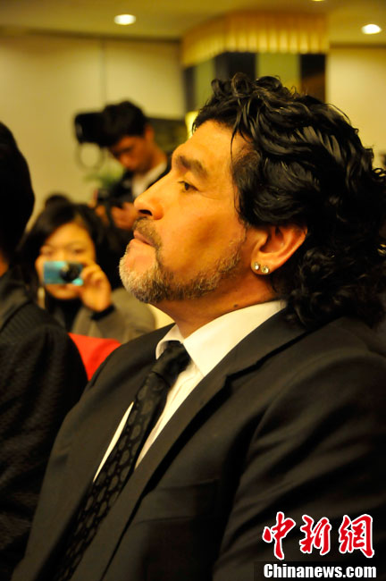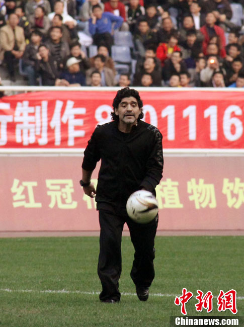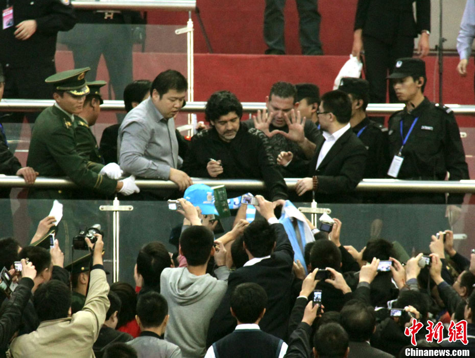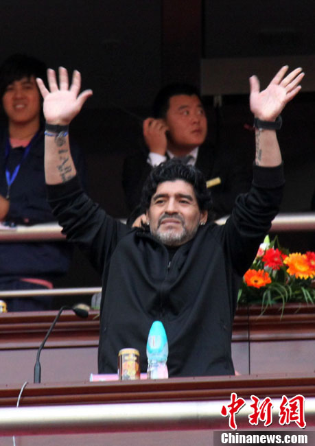11月5日下午16时左右,世界球王马拉多纳来到山东济南奥体中心参加山东联队与阿根廷明星队的慈善比赛。图为马拉多纳向现场的观众和球迷挥手致意。中新社发 牛杰峰 摄