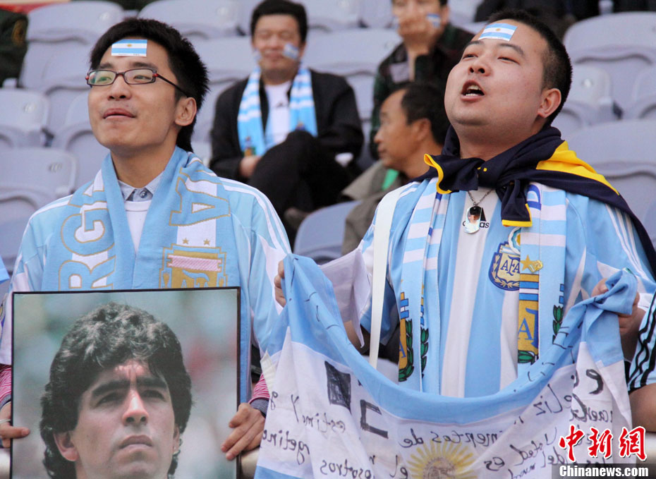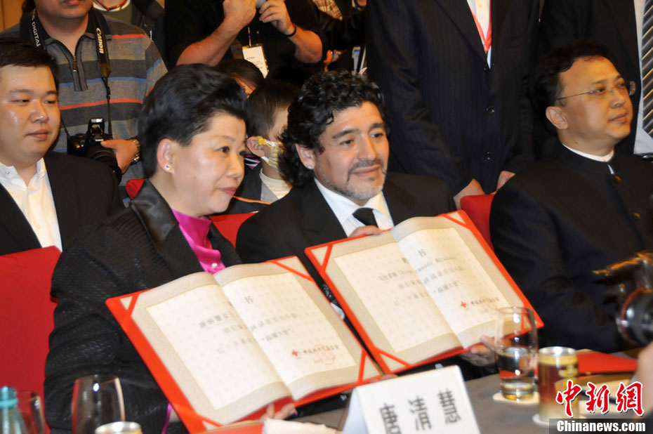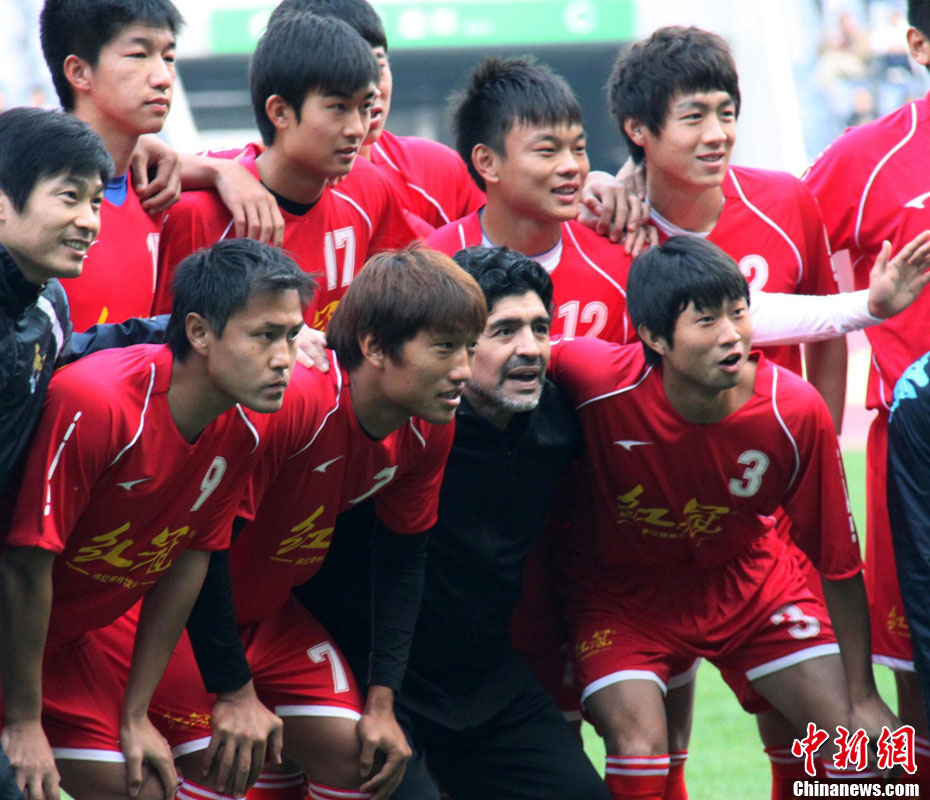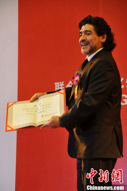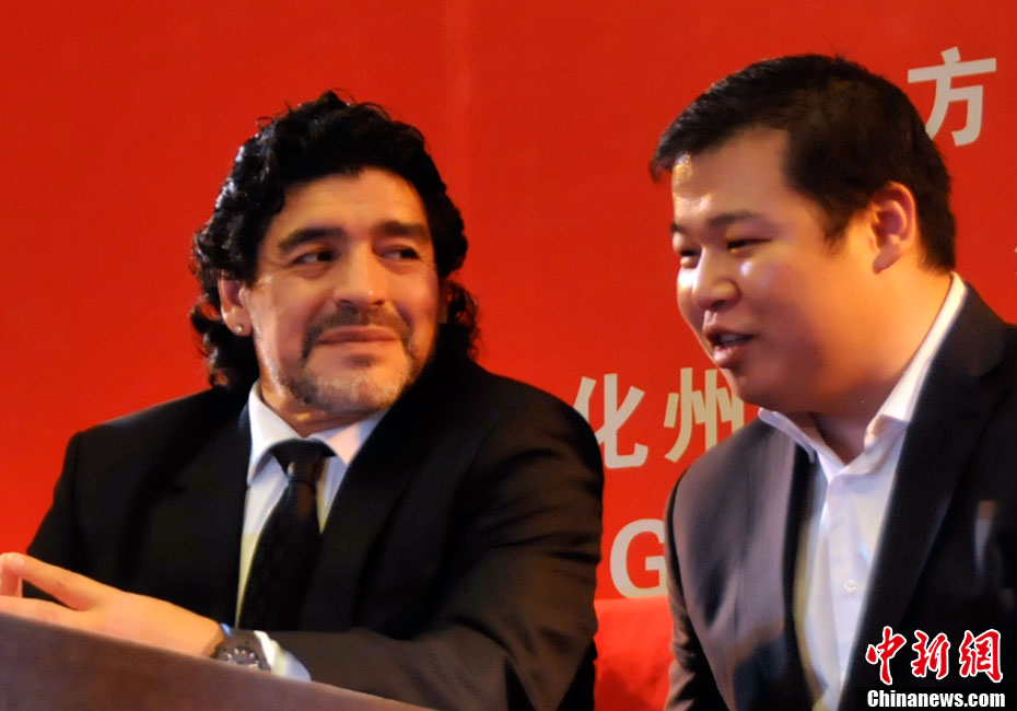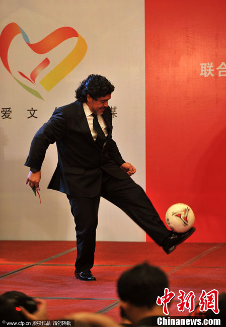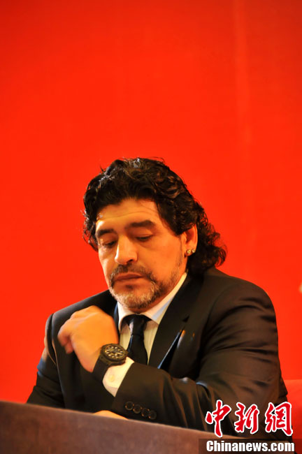 11月5日下午16时左右,世界球王马拉多纳来到山东济南奥体中心参加山东联队与阿根廷明星队的慈善比赛。图为马拉多纳向现场的观众和球迷挥手致意。中新社发 牛杰峰 摄