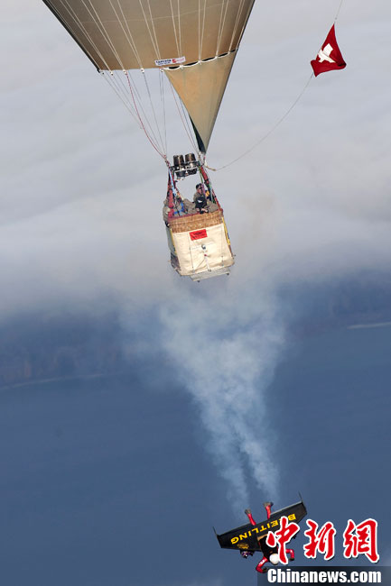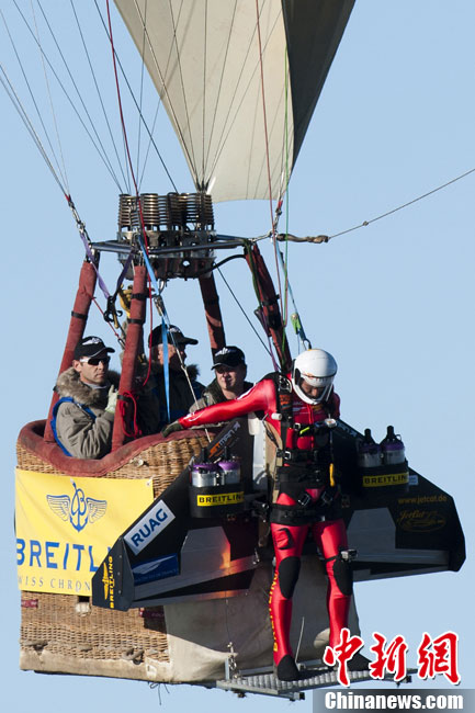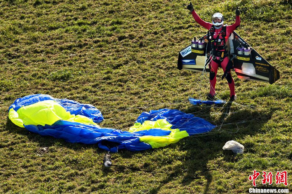 当地时间2010年11月5日,瑞士贝尔谢“火箭人”伊夫-罗西使用装有小型喷气发动机的喷气动力翼,首次完成空中翻转特技。
