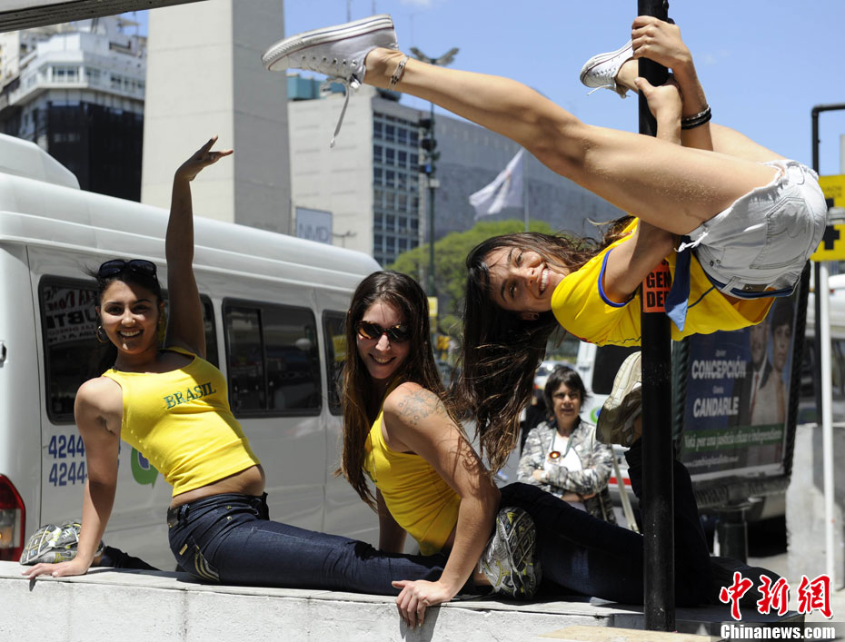 当地时间11月5日,阿根廷“钢管舞小姐大赛”评委在布宜诺斯艾利斯街头上演了火辣的钢管舞表演。