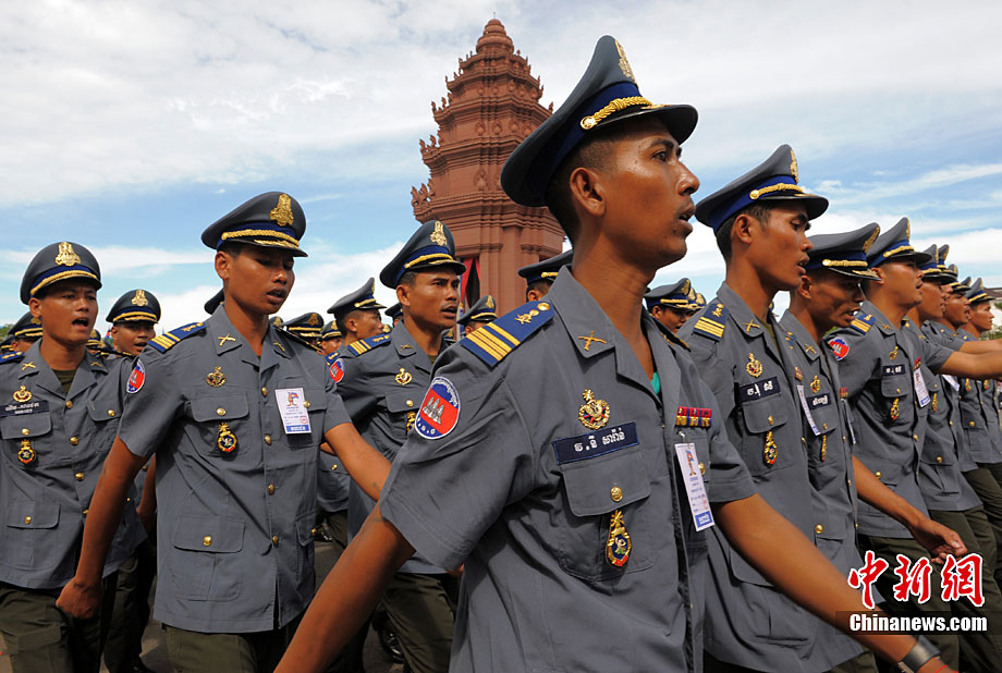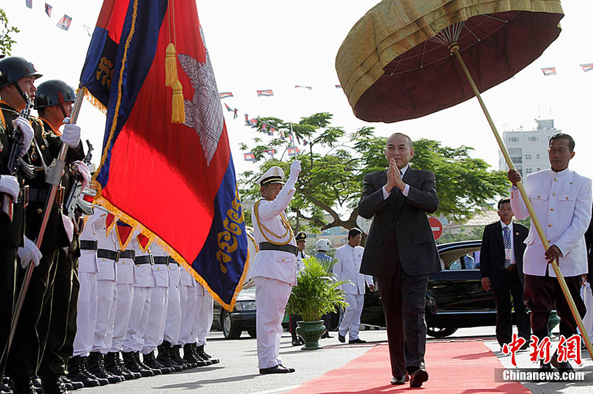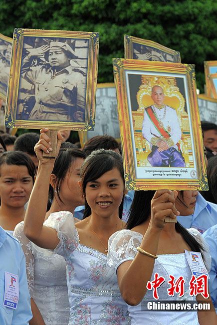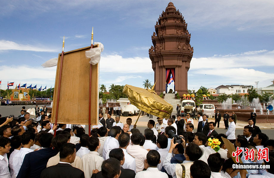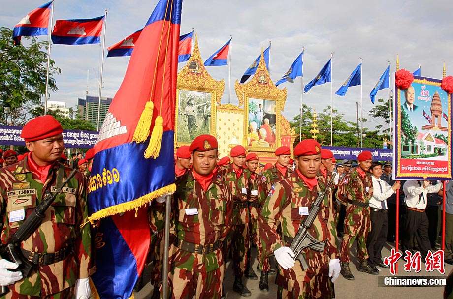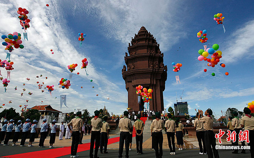 11月9日,工作人员在独立节庆祝仪式上放飞彩球。当天,柬埔寨在金边独立纪念碑广场举行盛大仪式,热烈庆祝国家独立57周年。柬埔寨国王西哈莫尼、国会主席韩桑林、政府首相洪森等政要以及各国驻柬使节和各界代表约2万人出席仪式。