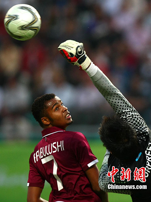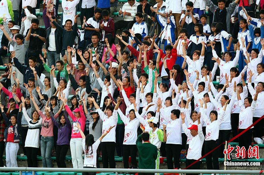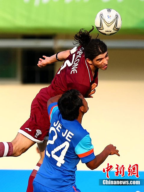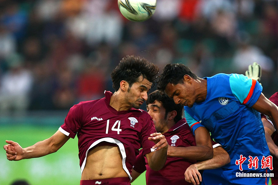 11月9日,第16届亚运会男足比赛展开D组的一场争夺,上届亚运会冠军卡塔尔队(红)在先失一球的情况下实现逆转,最终以2:1战胜印度队。图为观众为两队球员加油助威。中新社记者 富田 摄
