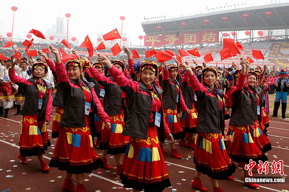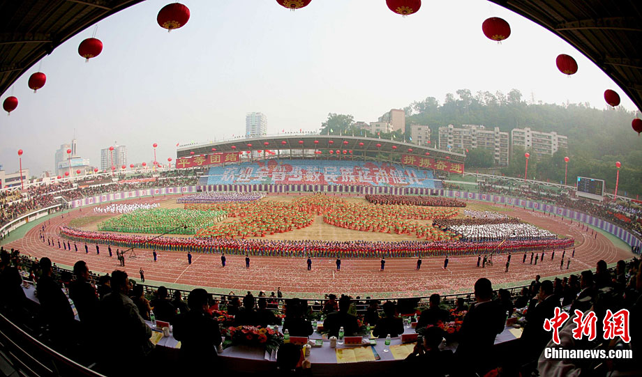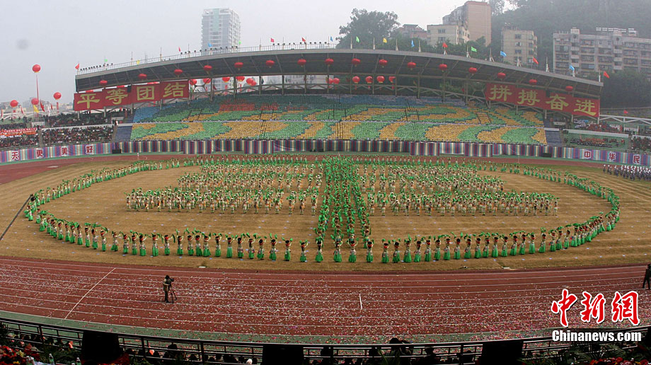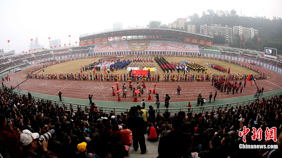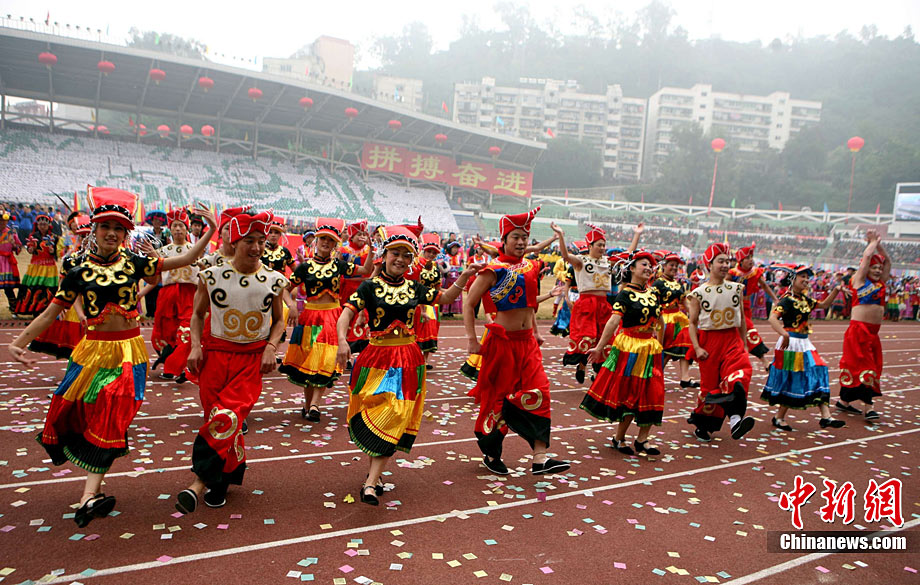 11月10日,四川省第13届少数民族体育运动会在攀枝花拉开帷幕。来自凉山州、甘孜州、阿坝州、乐山市、雅安市等10个市州以及西南民族大学、成都体育学院共12支代表队1066名运动员,将参加陀螺、民族式摔跤、田径等9个竞赛项目7天的比赛。本次运动会是四川历届少数民族运动会规模最大的一次,所有项目均可免费观看。中新社发 刘忠俊 摄