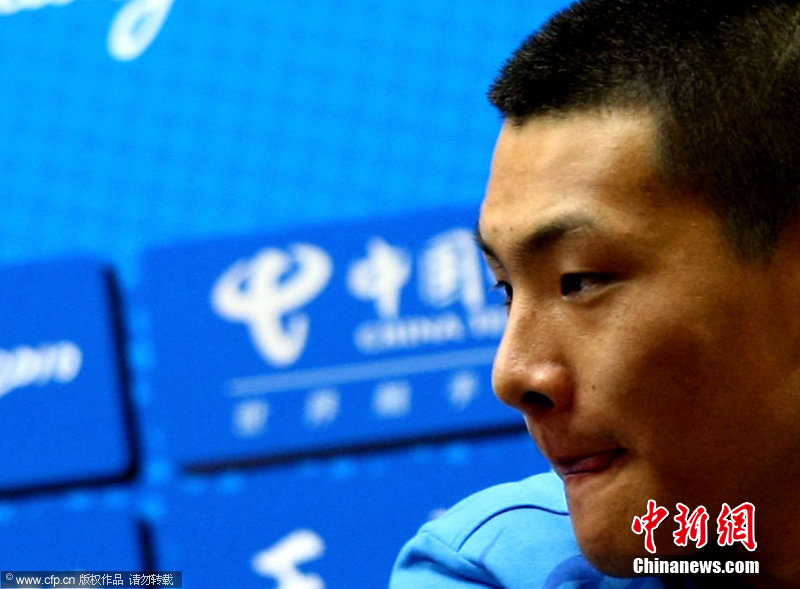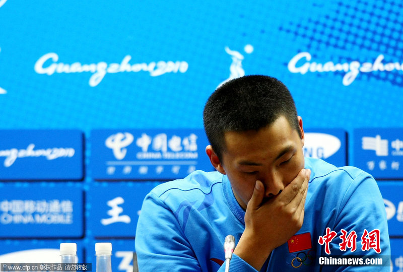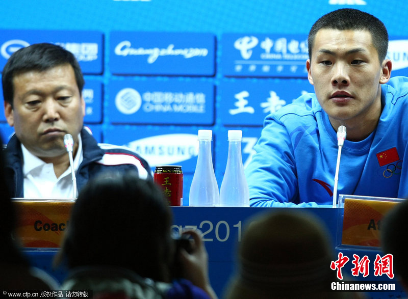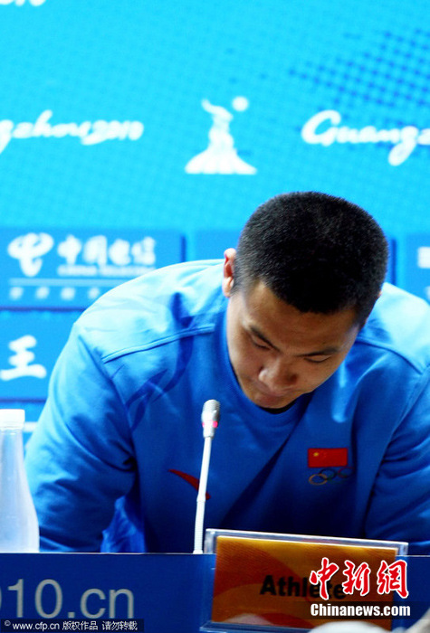 2010年11月10日,广州,2010亚运会男足A组次轮,中国Vs吉尔吉斯斯坦。王大雷出席赛后新闻发布会,就此前在微博上辱骂球迷的行为道歉。图片来源:CFP视觉中国