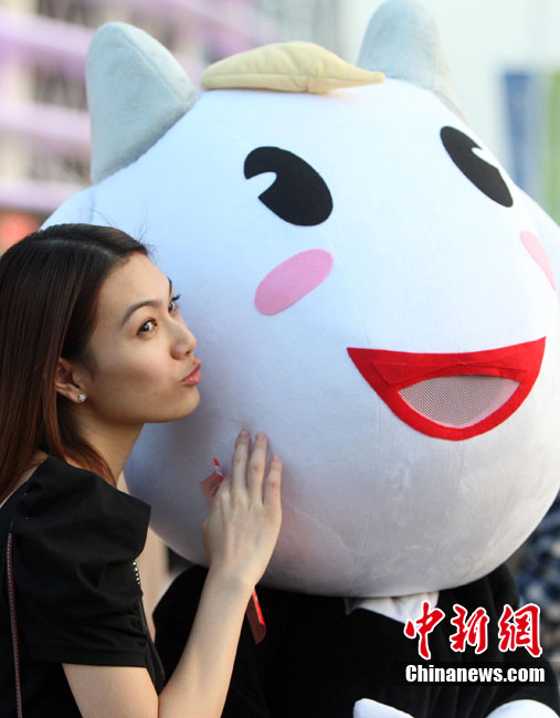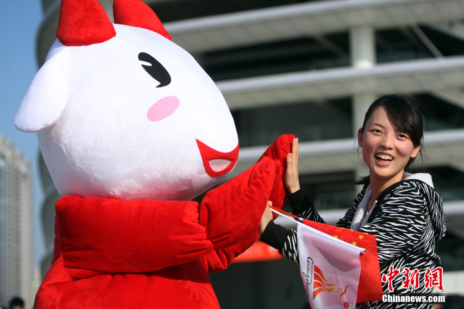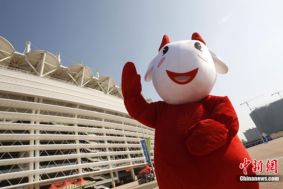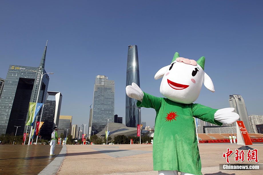 11月12日,广州亚运会开幕式现场准备就绪,吉祥物“祥和如意乐洋洋”在海心沙广场上迎接参加开幕式的嘉宾。中新社记者 杜洋 摄