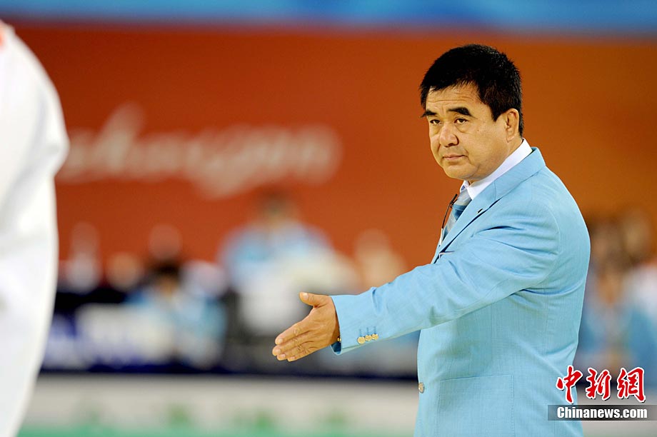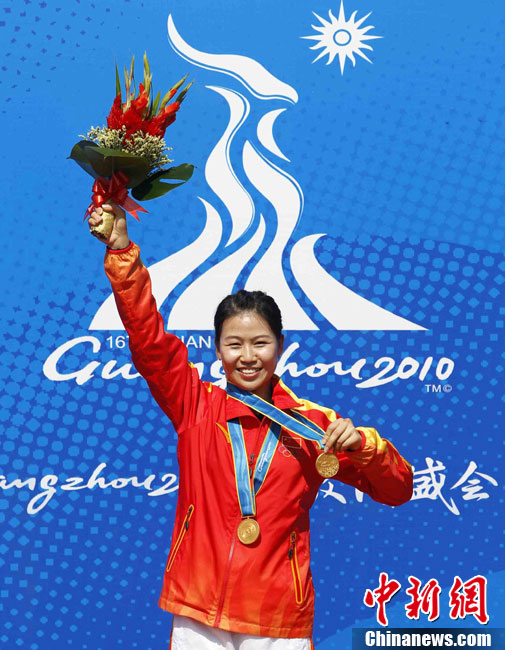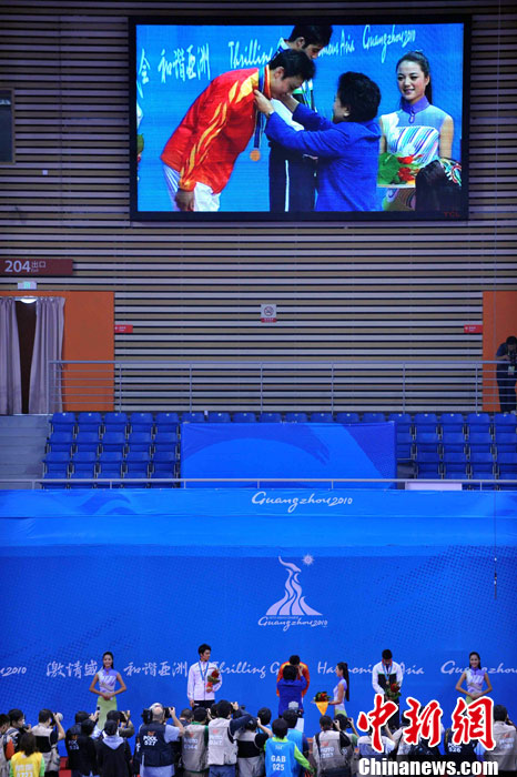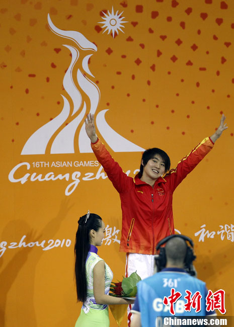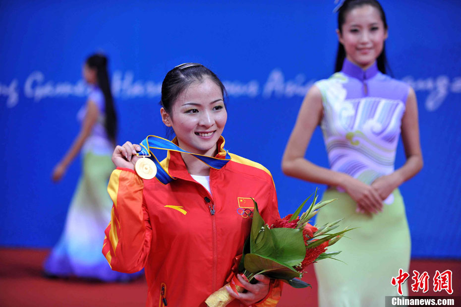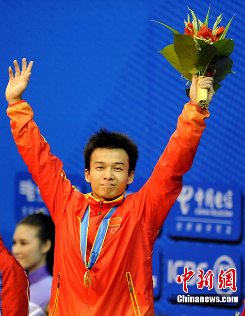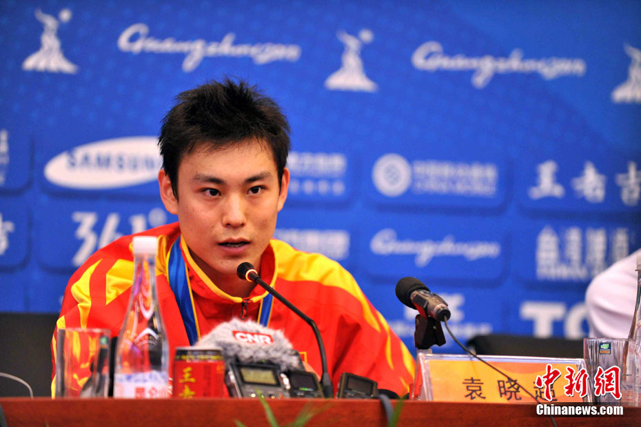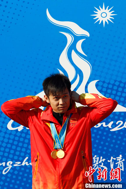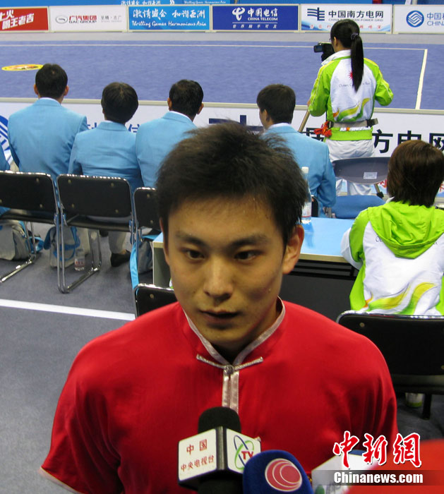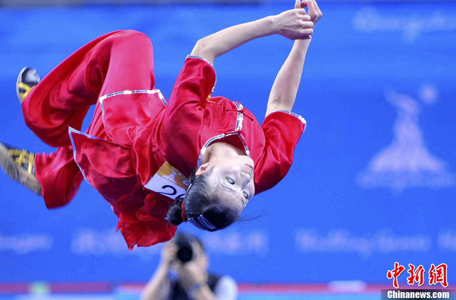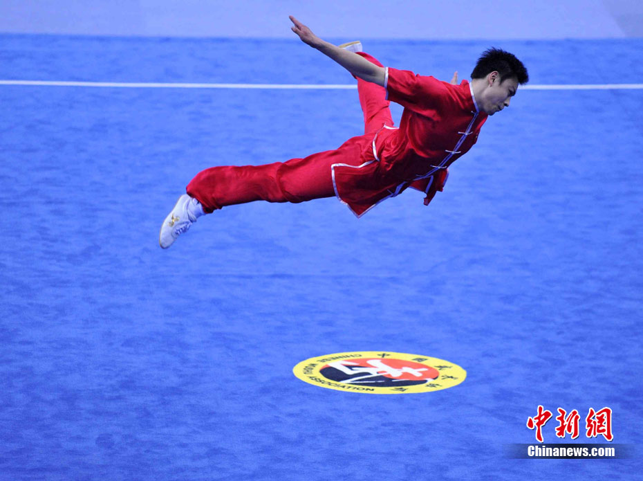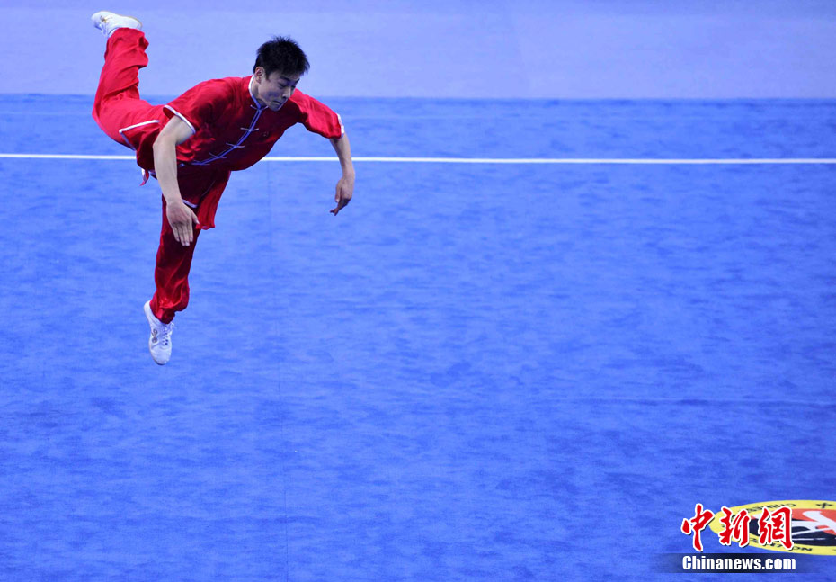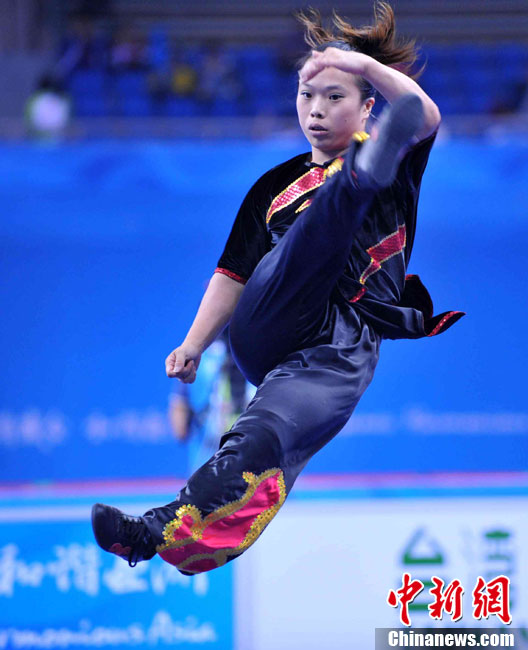 11月13日上午,中国选手袁晓超夺得男子长拳冠军,这也是本届亚运会诞生的首枚金牌。 中新社记者 柯小军 摄