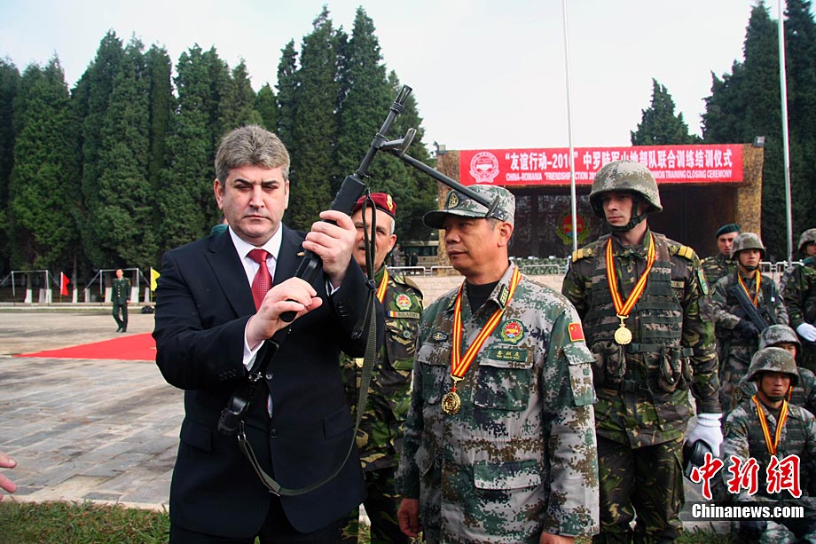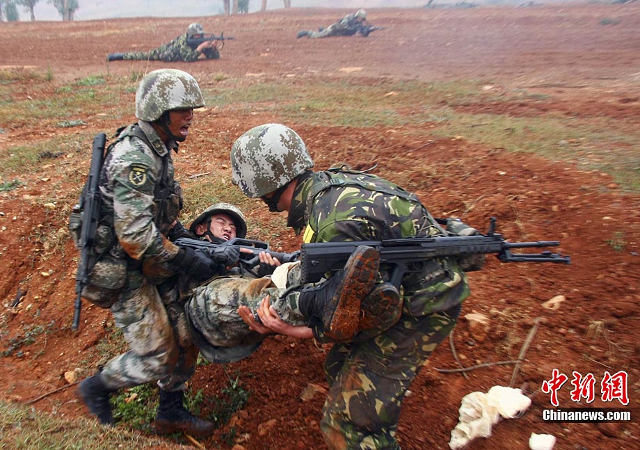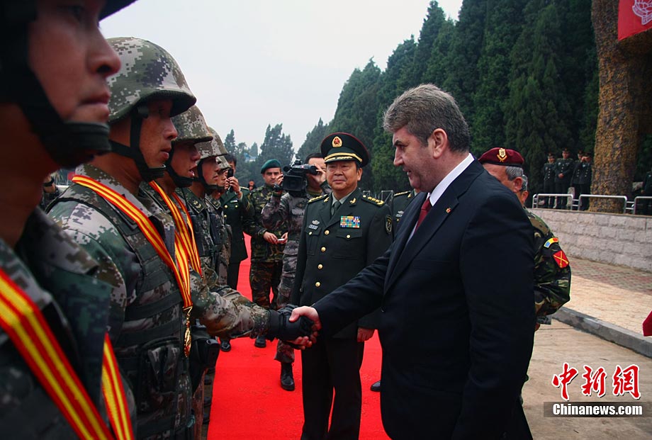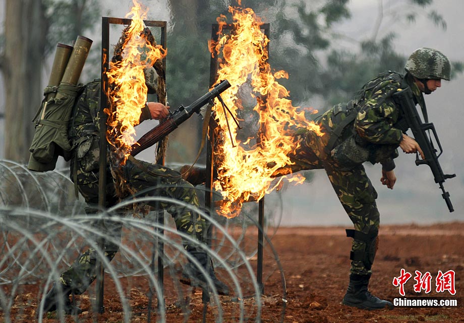 11月13日,“友谊行动-2010”中国与罗马尼亚陆军山地部队在云南昆明进行了9天的联合训练后结束。中罗双方士兵在结训仪式上进行了步枪、狙击枪射击的汇报表演和混合编队克服山地障碍等战术综合演练。图为中罗双方士兵表演战术综合演练穿过火圈。中新社发 任东 摄