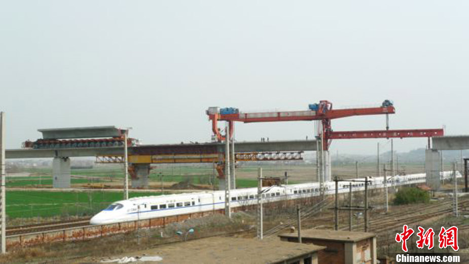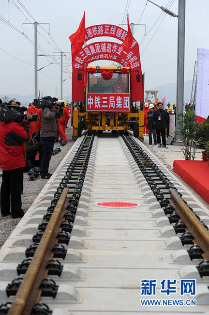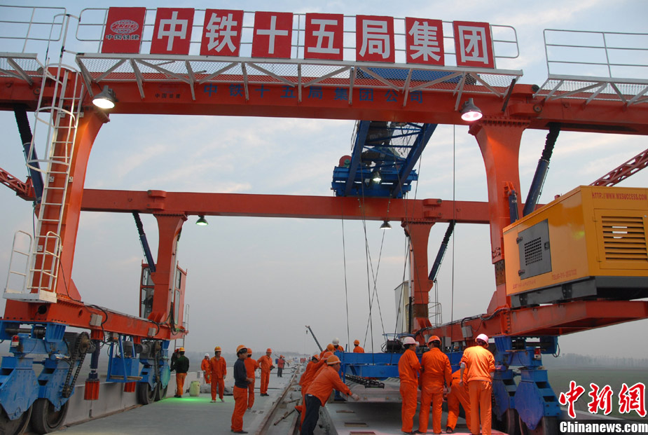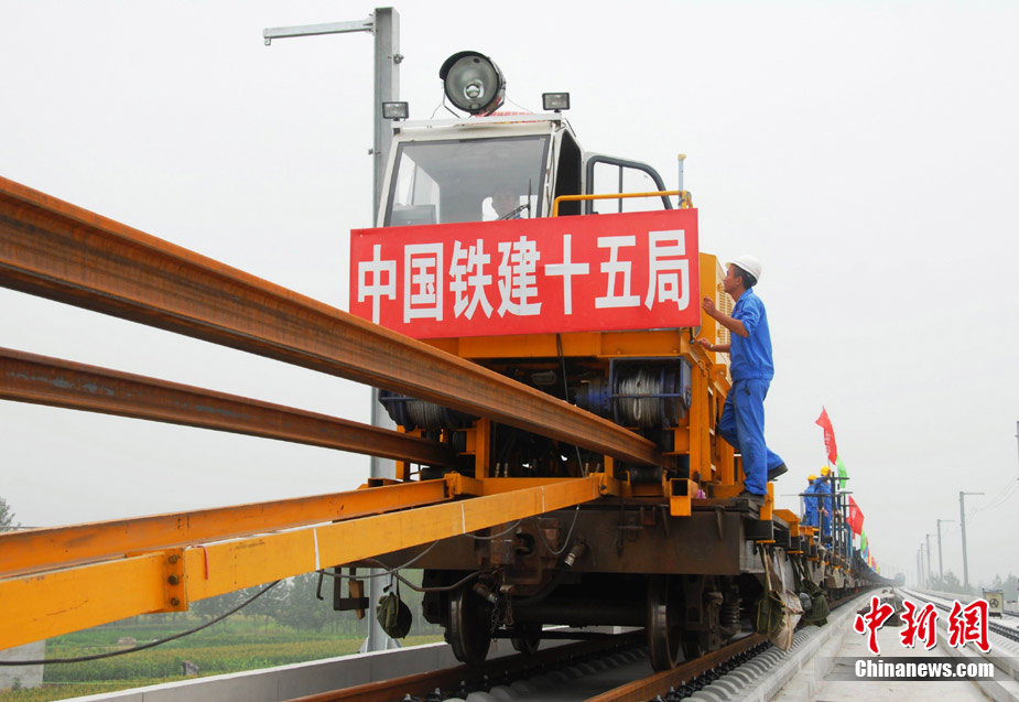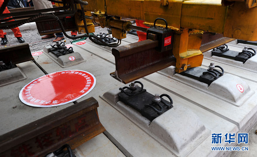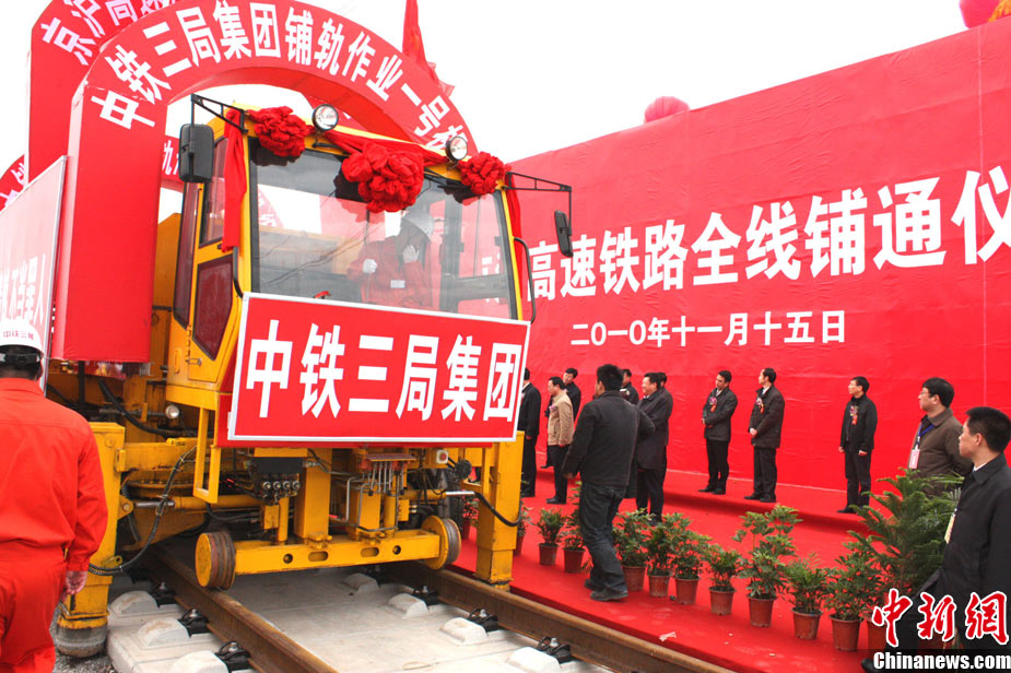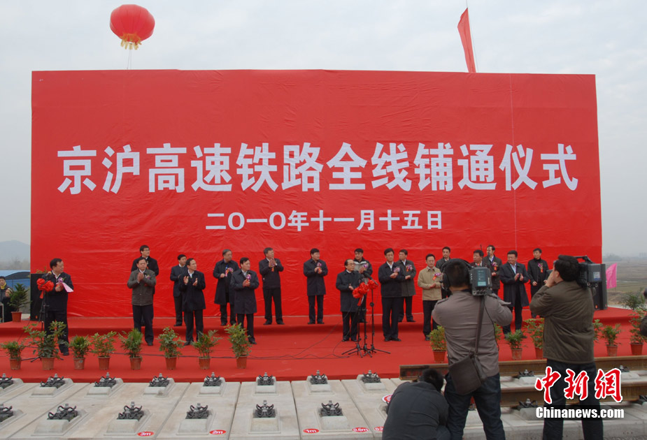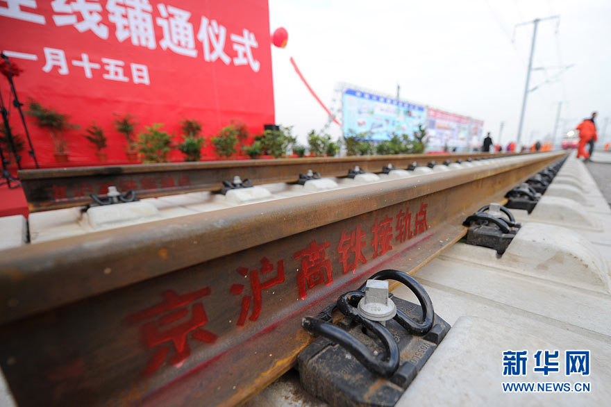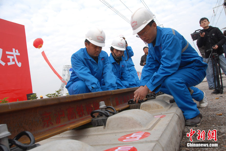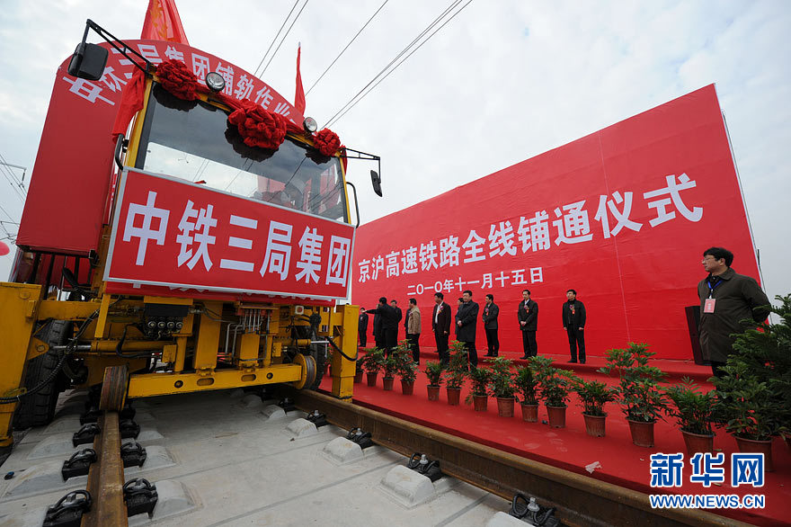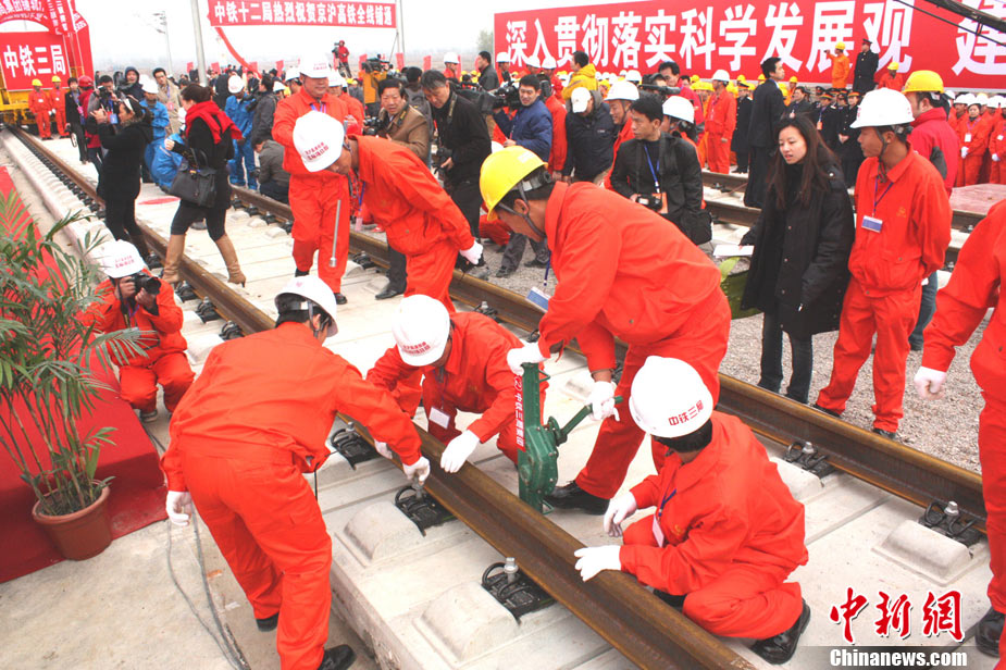 11月15日上午,随着最后一根铁轨在安徽蚌埠段顺利铺下,京沪高速铁路全线完成铺通工程,这是京沪高速铁路建设取得的又一重大阶段性成果。京沪高速铁路的全线铺通,标志着以线下工程和铺轨为主的站前工程全部结束,下一步将全力推进以牵引供电、通信、信号、电力“四电集成”施工和站房建设为主的站后工程施工,展开全线联调联试。图为15日,京沪高铁先导段铺通仪式在京沪高铁蚌埠南火车站举行。中铁十五局员工在接轨点安装最后一组钢轨锁定螺栓。(张智海 范刚军 李红)