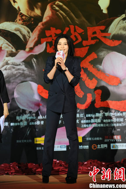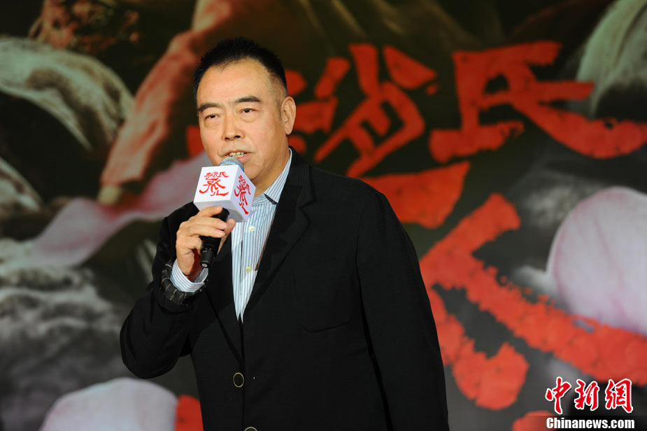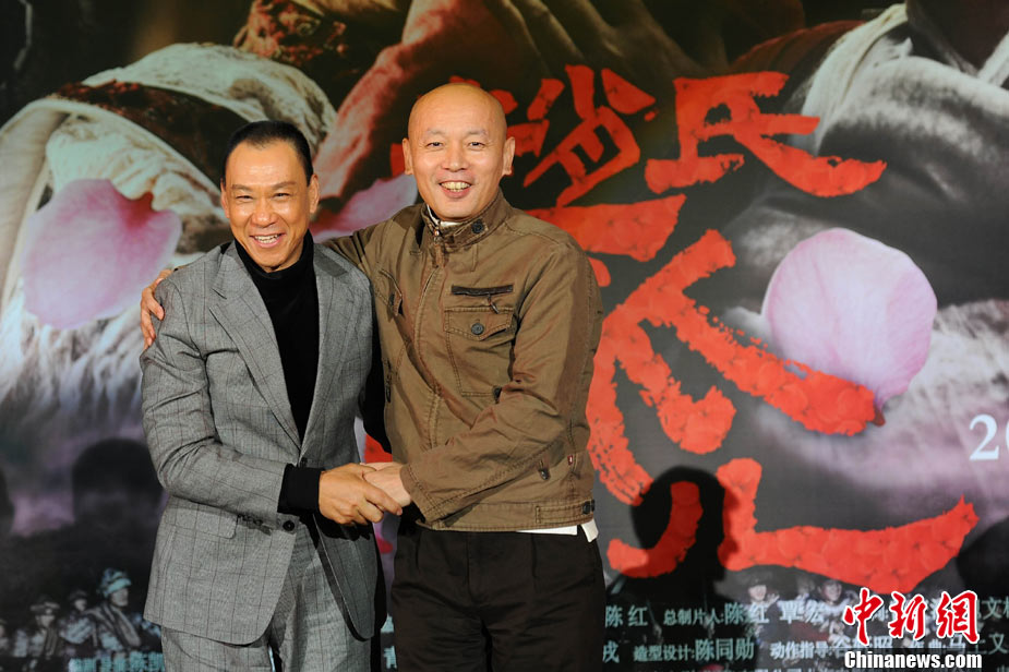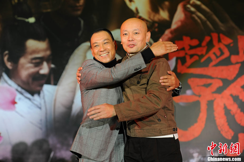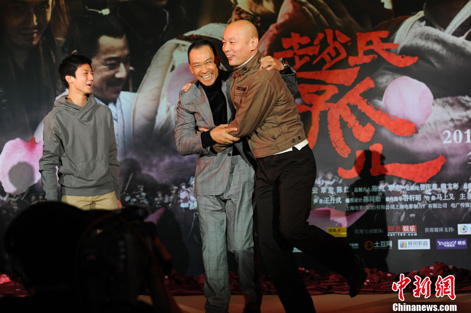 11月15日,贺岁档大片《赵氏孤儿》群星闪耀媒体见面会在北京盛大举办。导演陈凯歌携主演葛优、王学圻、黄晓明、范冰冰、赵文卓、海清、赵文浩出席。葛优、王学圻饰演的程婴和屠岸贾在片中有诸多较量,此前传闻两位大腕暗自使劲、互相飚戏。为了打破传言,现场葛优、王学圻上演“亲密熊抱”,王学圻出人意料的“背摔”让葛优险些摔倒在地。现场气氛热烈,笑声不断。中新社记者 李学仕 摄
