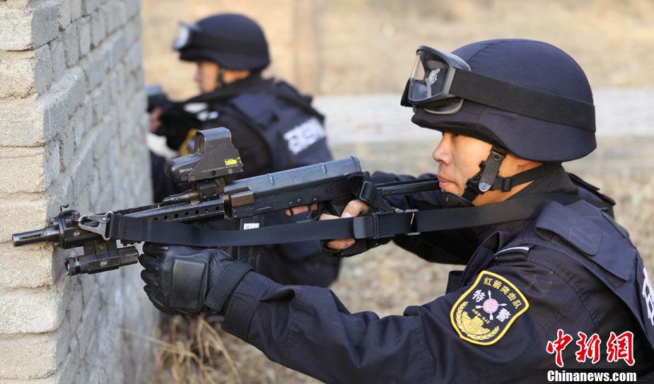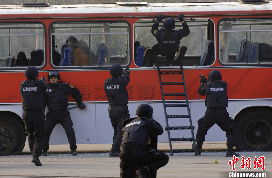 11月16日,河北石家庄特警、治安警、刑警、武警、交警、消防等多警种联动,举行代号为“红箭突击——2010”大型反恐处突应急拉动演练。据指挥部有关负责人介绍,此次演练从实战出发,主要分为参演队伍分列式和处突实兵演练,以检验重大案(事)件应急处突力量的协同配合和处置能力。图为特警“解救”客车上的游人。中新社发 刘志敏 摄