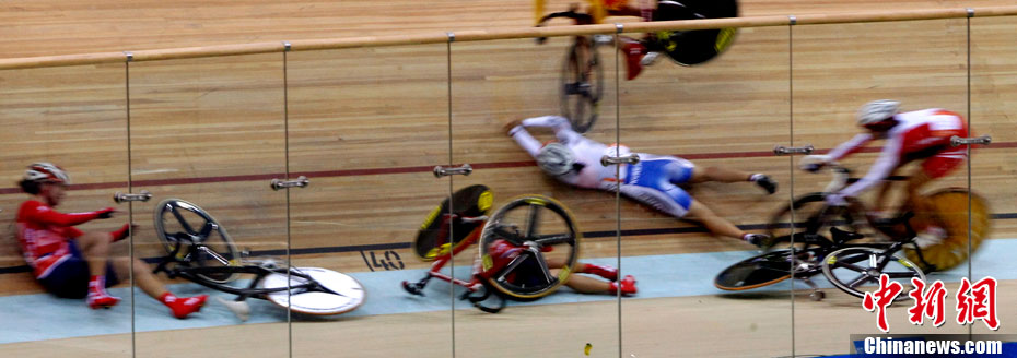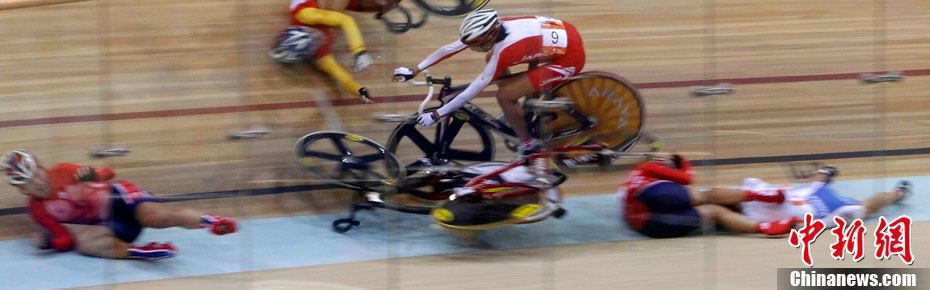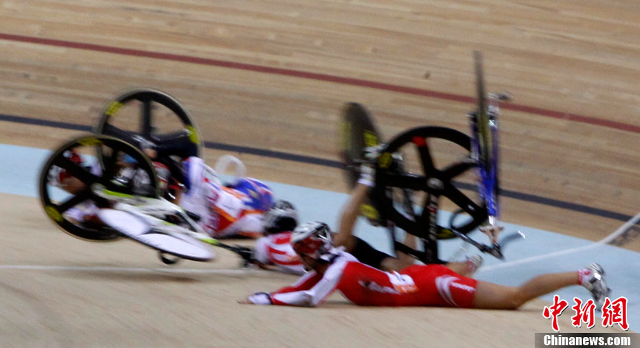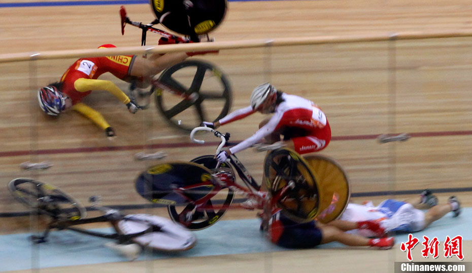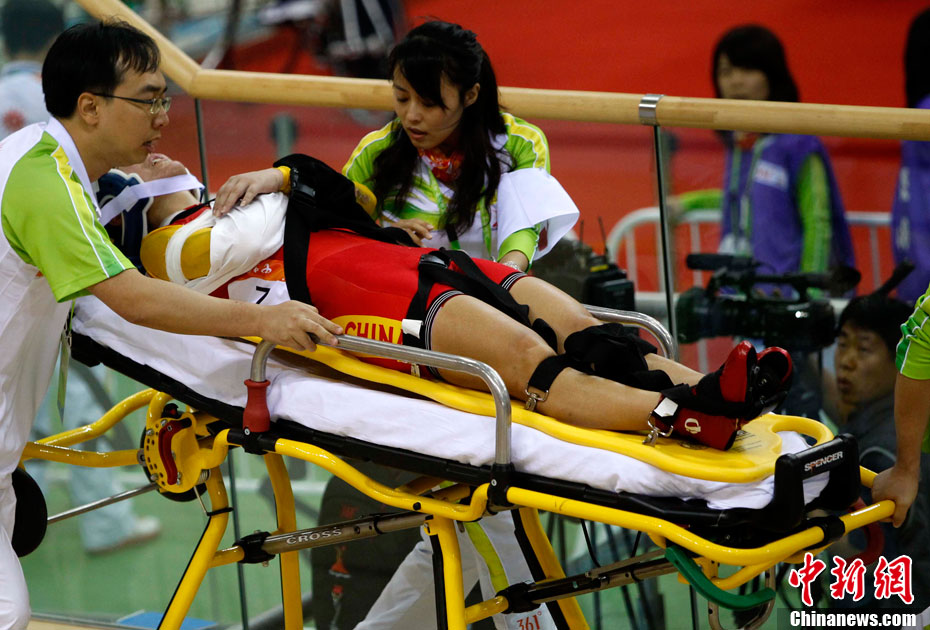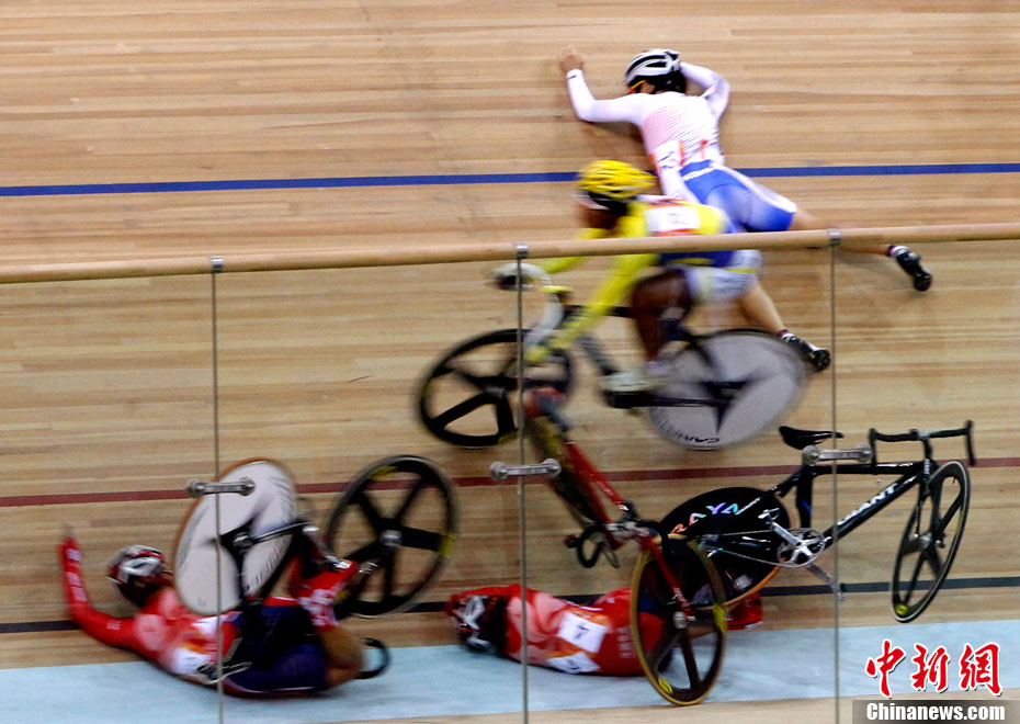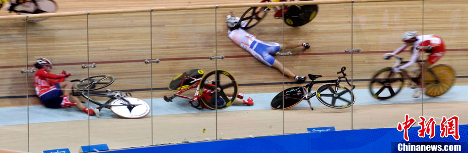 11月16日,广州亚运会自行车比赛进入第四天,在女子积分赛比赛的最后冲刺阶段,突发严重车祸,七位比赛选手均翻车倒地被送往医院救治。其中中国的汤科蓉伤势最为严重,被送往医院急救。中新社记者 赵振清 摄