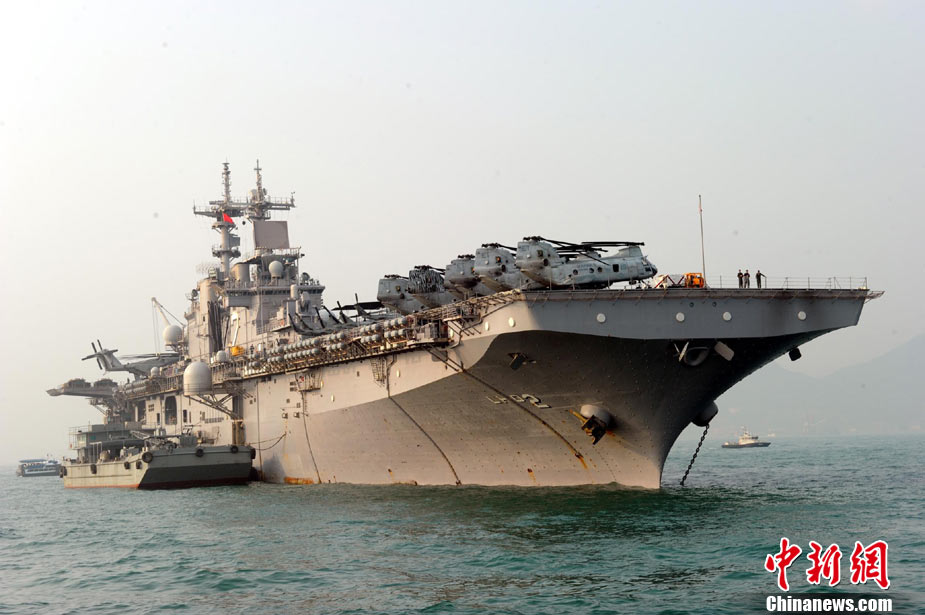 11月16日,美国海军黄蜂级埃塞克斯号两栖攻击舰,停靠香港进行补给。该舰搭载有AV-8B“鹞”式战机、CH-53E“海上种马”直升机、CH-46E“海上骑士”直升机、UH-1N超级休伊直升机等逾30架各型机型。中新社记者 郑祚声 摄