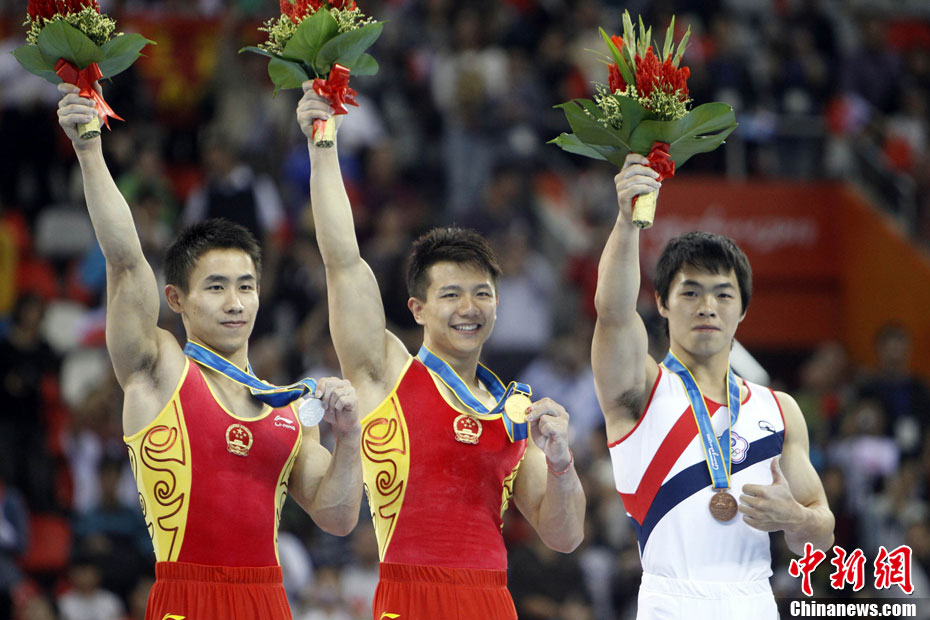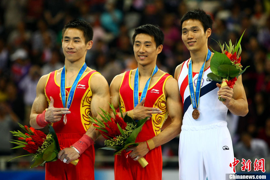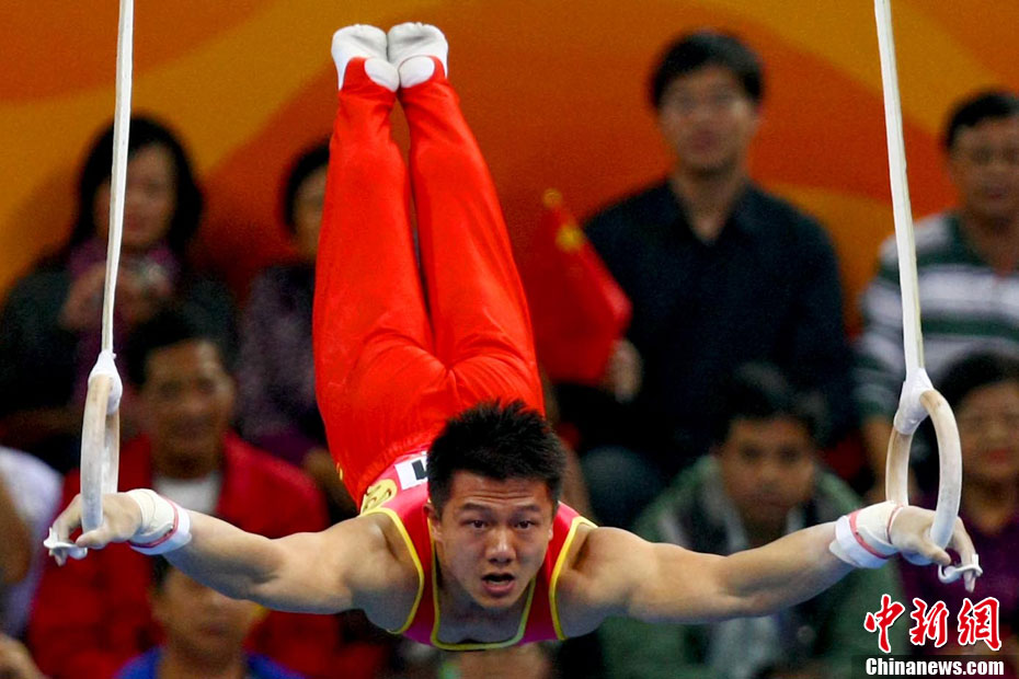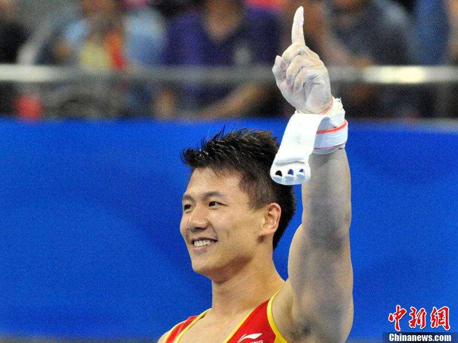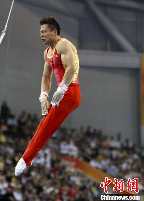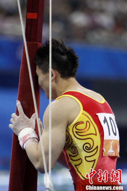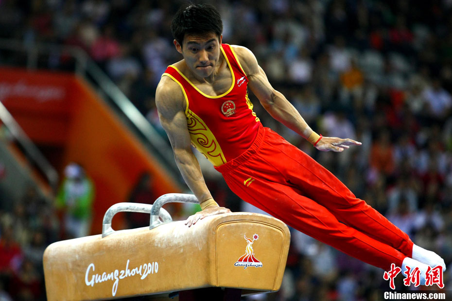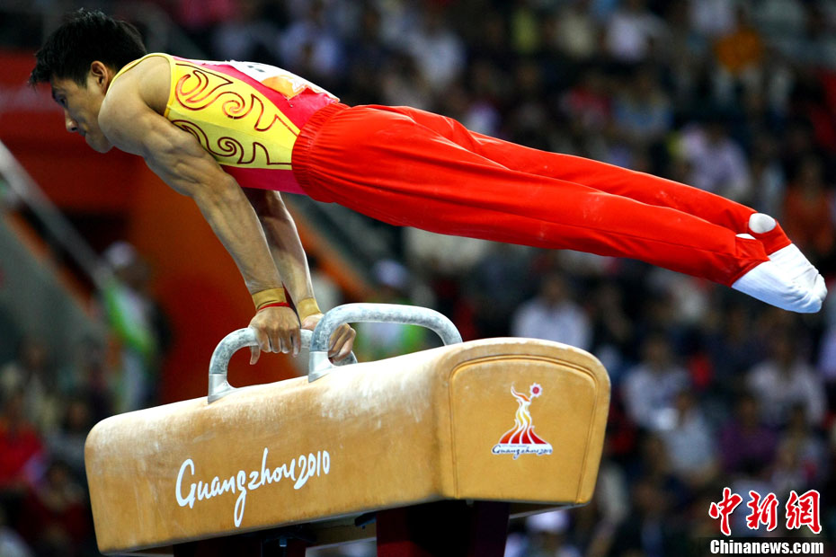 11月16日,2010年广州亚运会体操比赛继续在亚运城体育馆进行。在男子鞍马决赛中,雅典奥运会冠军、中国名将滕海滨(图)以15.375分如愿摘金;银牌被另一位中国选手严明勇获得,成绩为14.726;中华台北选手黄哲奎以14.70分排在第三。这已是滕海滨在本届赛事中,继男子团体和个人全能之后收获的第三块金牌。中新社记者 富田 摄