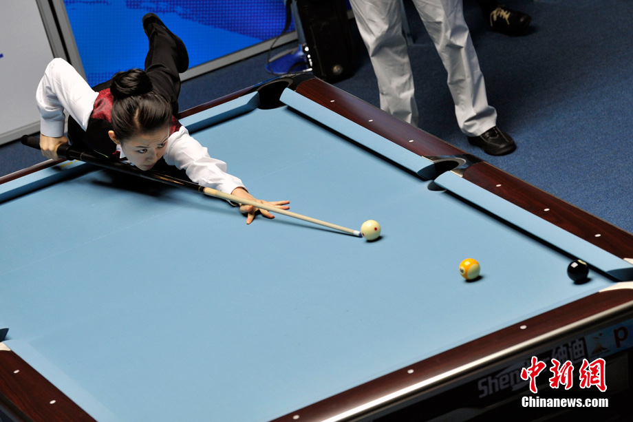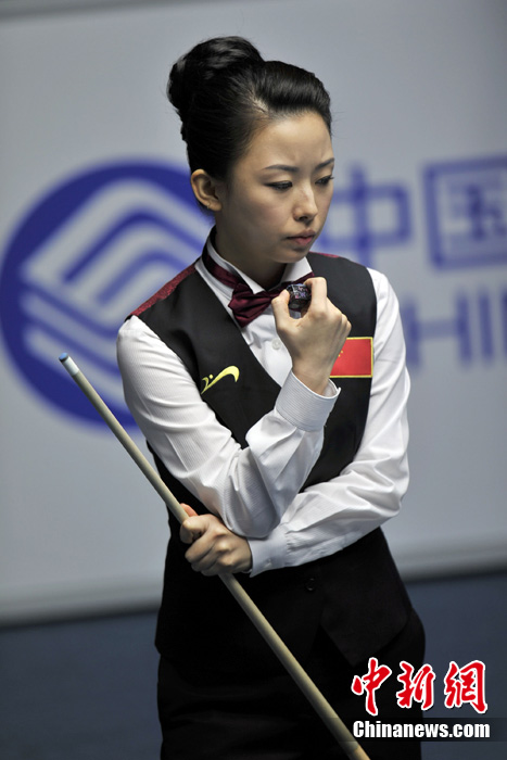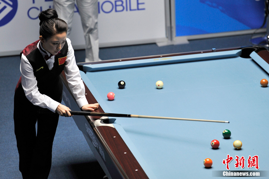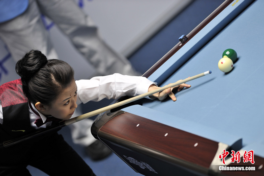 11月19日下午,广州亚运会女子美式9球单打决赛在亚运城体育馆上演,经过2个多小时的激烈角逐,中国选手潘晓婷以7:5力克中华台北选手周婕妤,最终夺冠。中新网记者 金硕 摄