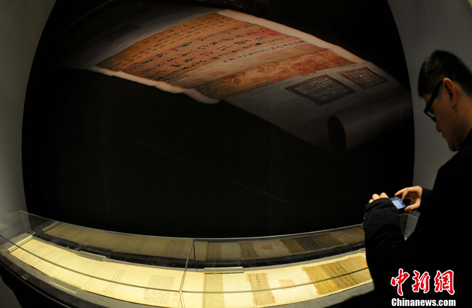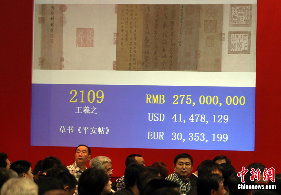 11月20日晚,在中国嘉德2010秋季拍卖会“秋光万华——清代宫廷艺术集粹”专场中,王羲之草书《平安帖》以人民币三亿零八百万成交。中新社记者 杨可佳 摄