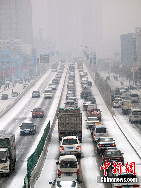 新疆乌鲁木齐11月22日上午再度降下大雪,由于大雪的缘故,乌鲁木齐街道部分路段交通拥堵,车辆排起长队。中新社记者 孙亭文 摄