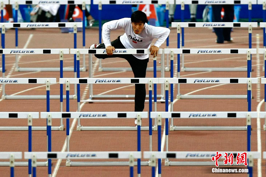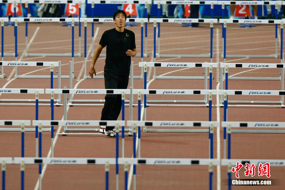 11月22日,广州亚运会田径赛场,男子110米栏的预赛,中国著名运动员刘翔登场亮相。图为刘翔在进行赛前热身。中新社记者 富田 摄