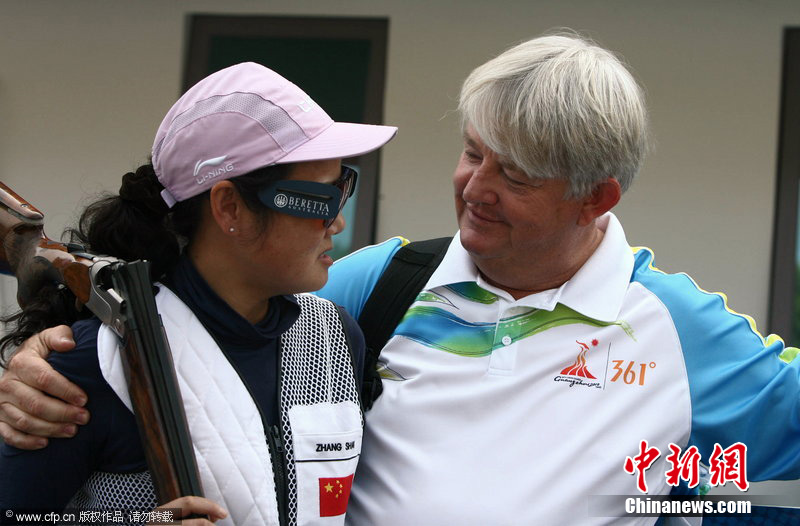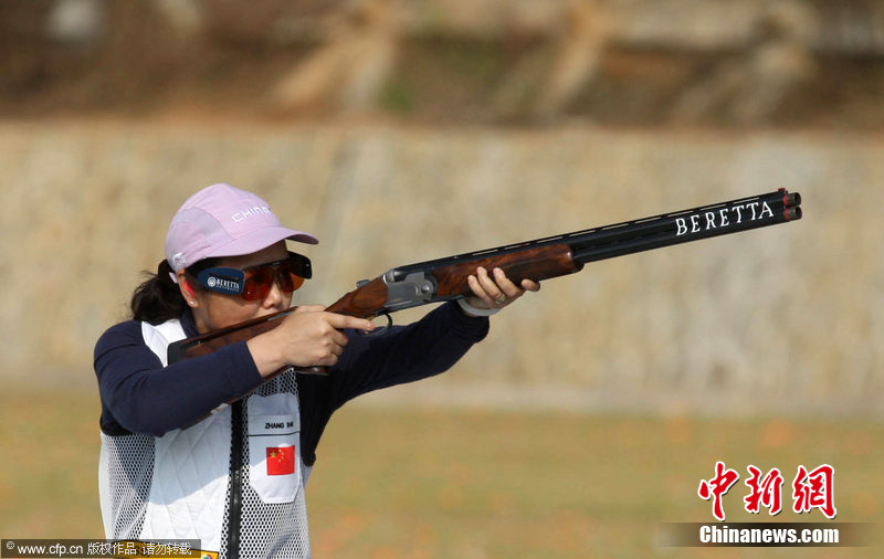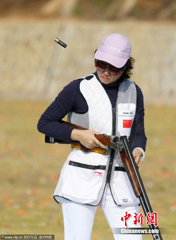 2010年11月23日,广州亚运会射击女子双向飞碟赛场,由张山、魏宁、魏萌组成的中国队,以较大的优势夺冠。扛着“老枪”上阵的张山,是唯一参加过在中国举办的两届亚运会的运动员。她甚至放言要参加伦敦奥运会。图片来源:cfp视觉中国