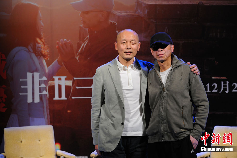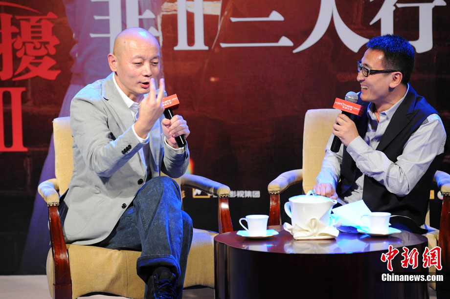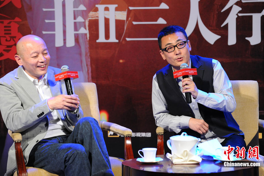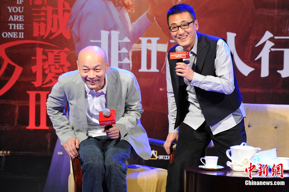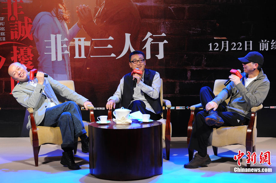 由华谊兄弟出品、冯小刚导演、王朔与冯小刚联合编剧的《非诚勿扰2》将于12月22日贺岁上映。11月24日,《非诚勿扰2》举行了“《非2》三人行”发布会,正式发布《非诚勿扰2》升级版幕后花絮,冯小刚、葛优、窦文涛组成三人行搭档。在窦文涛的幽默调侃下,葛优冯小刚热聊新戏,笑声不断。在当场公布的升级篇幕后花絮中,秦奋和梁笑笑的亲密戏也出露端倪,葛优舒淇在美景中多次深情依偎,一场两人在床上的镜头更令人期待。冯小刚承认,“是多了一些亲密戏,但都是幽默的处理。”葛优也谦虚表示,自己演亲密戏其实并不拿手。中新社记者 李学仕 摄