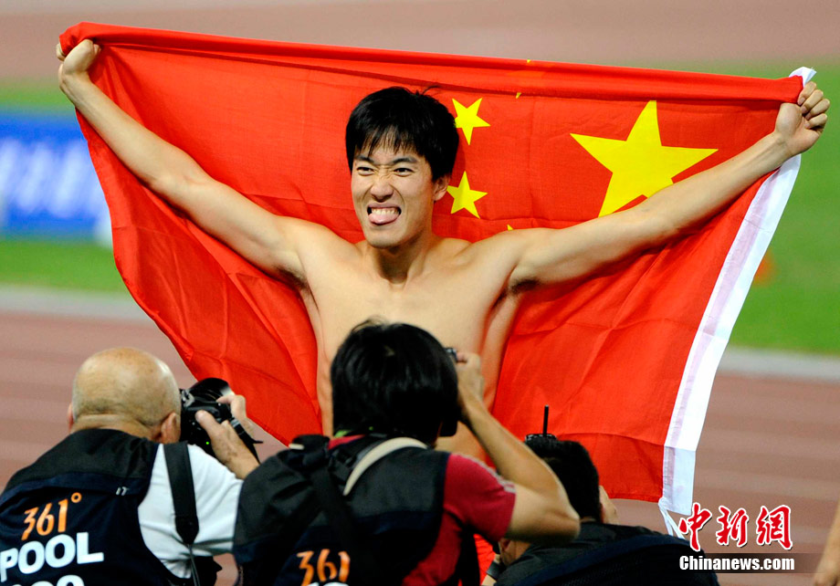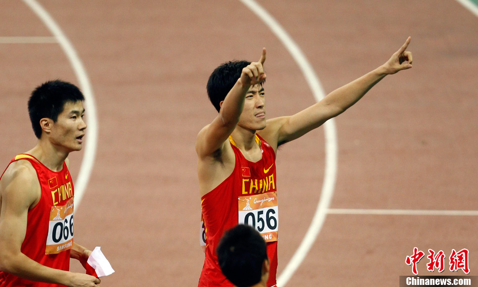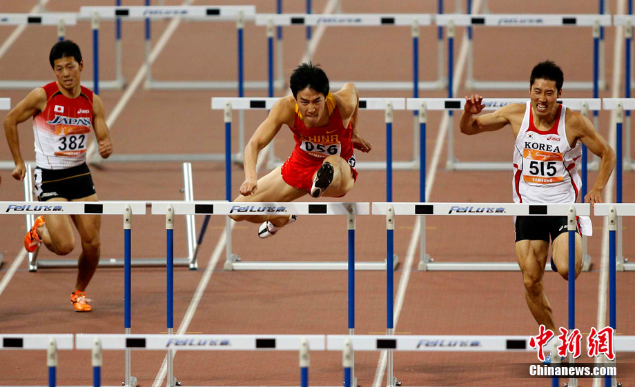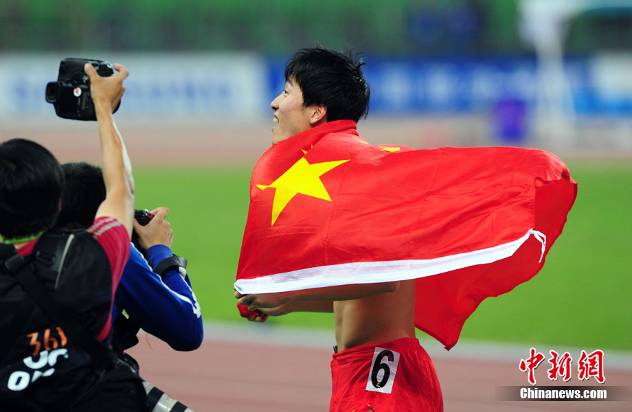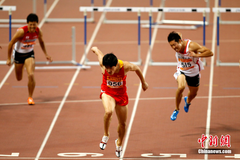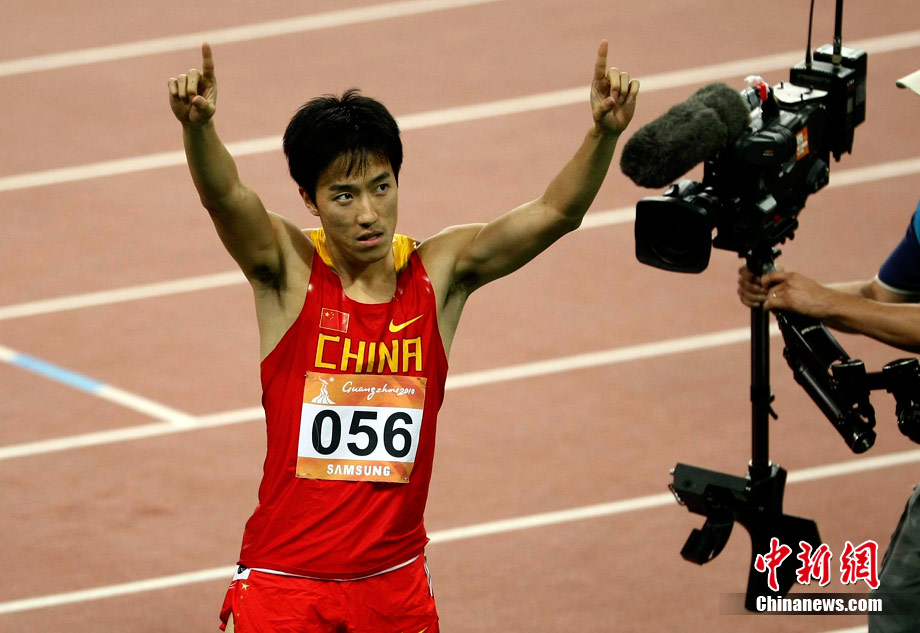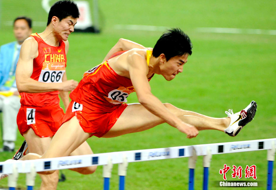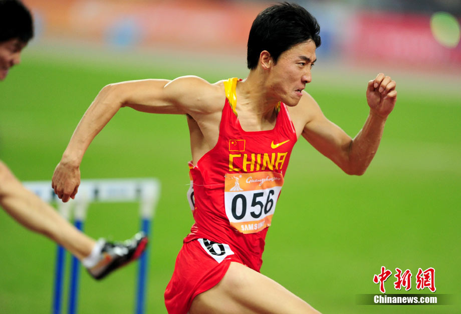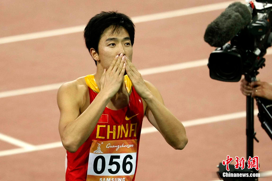 11月24日,广州亚运会男子110米栏决赛,刘翔以13秒09的成绩夺得金牌,这一成绩打破了亚运会纪录。刘翔以一场酣畅淋漓的胜利宣告了自己的回归。中新社记者 王东明 摄