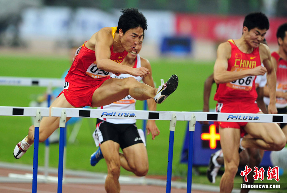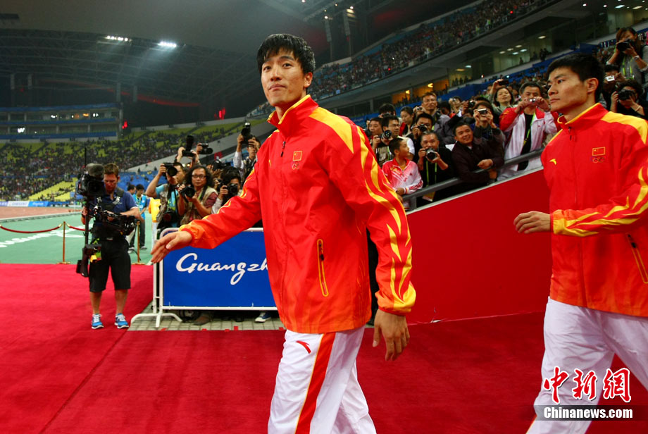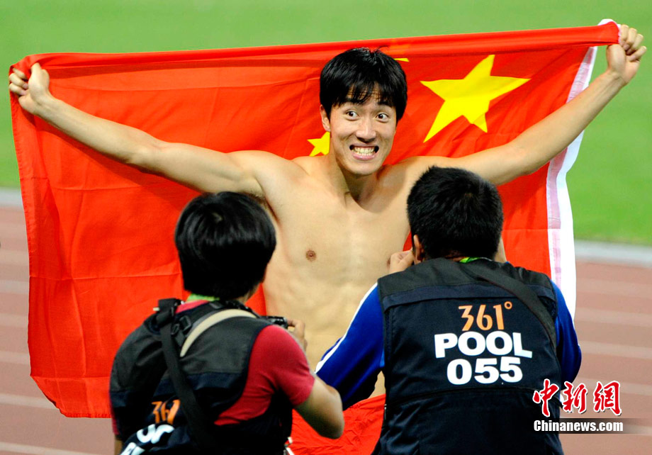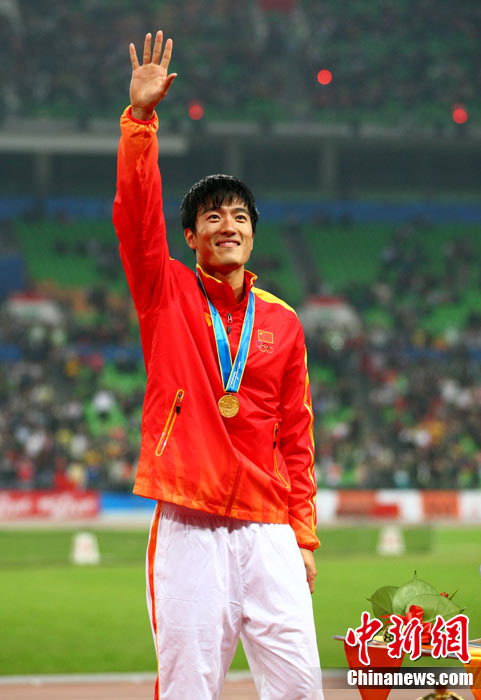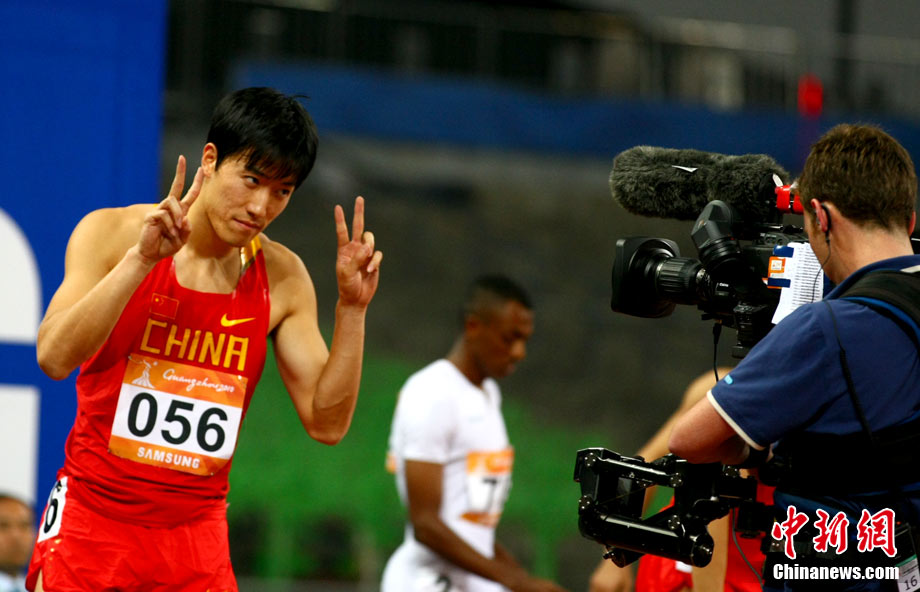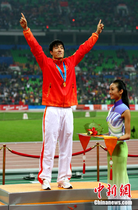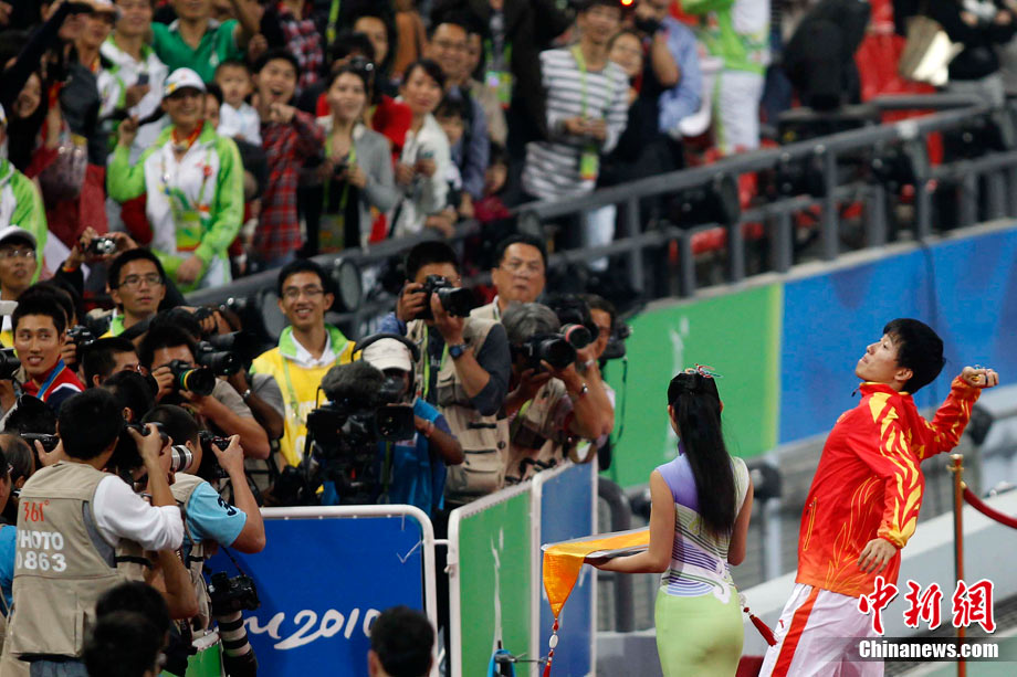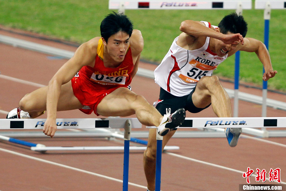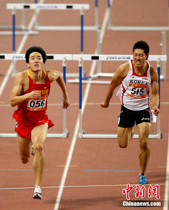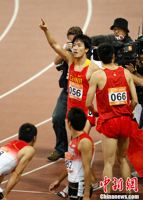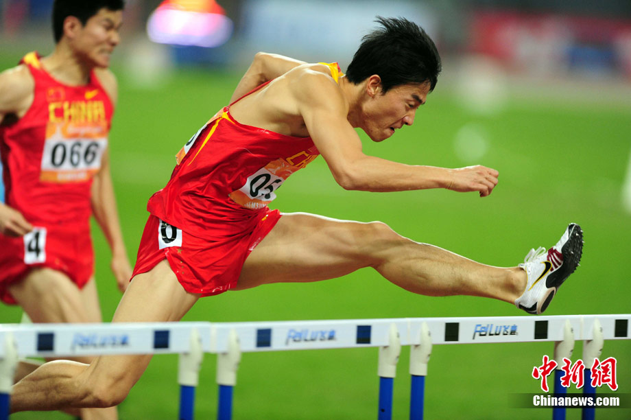 11月24日,广州亚运会男子110米栏决赛,刘翔以13秒09的成绩夺得金牌,这一成绩打破了亚运会纪录。刘翔以一场酣畅淋漓的胜利宣告了自己的回归。中新社记者 王东明 摄
