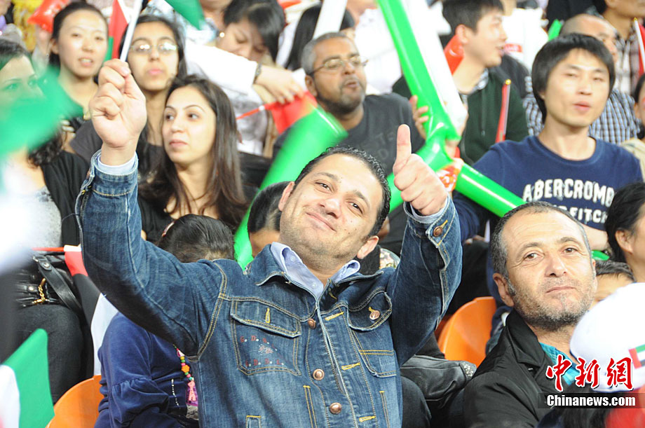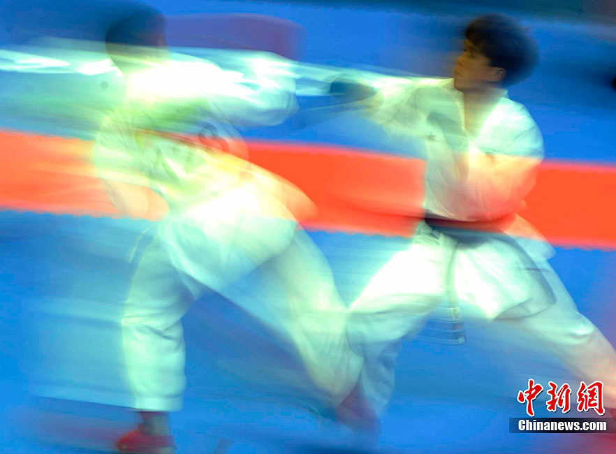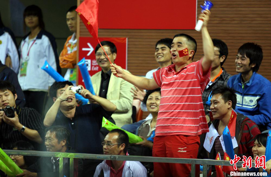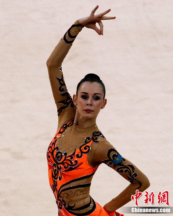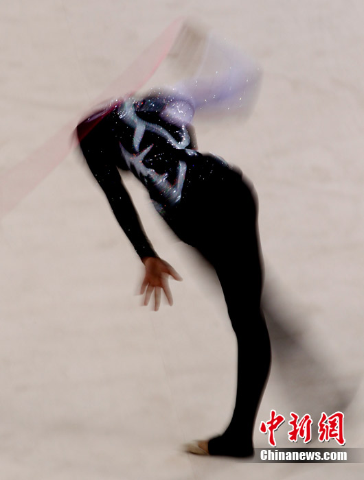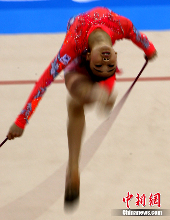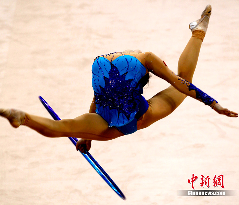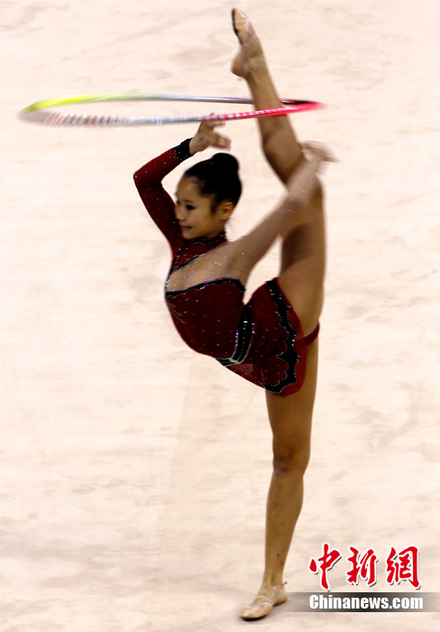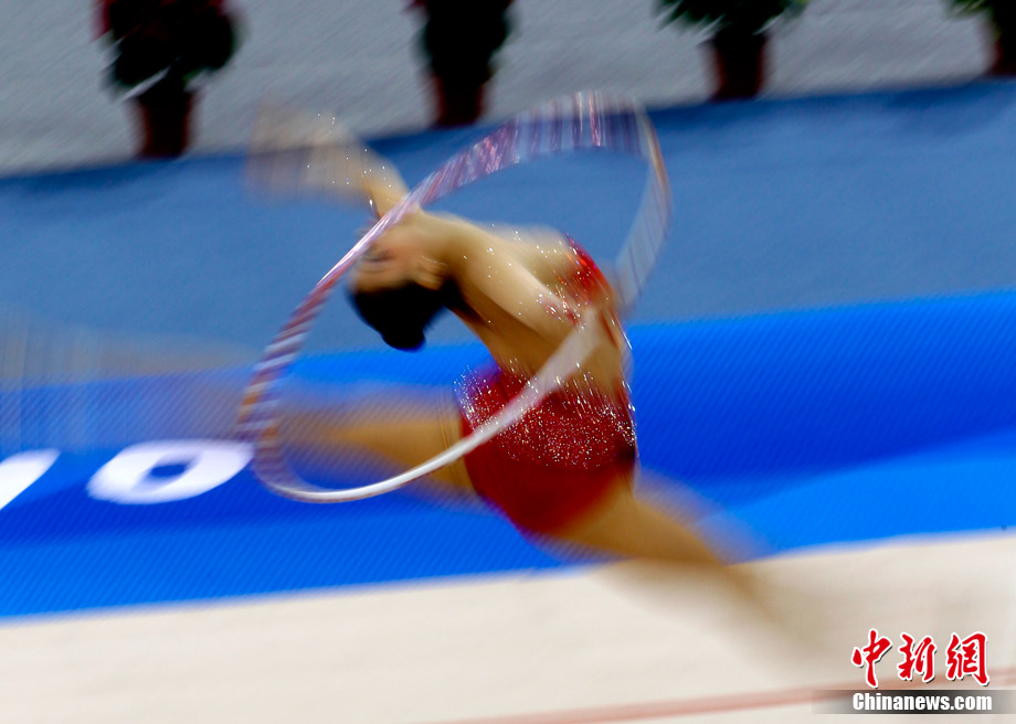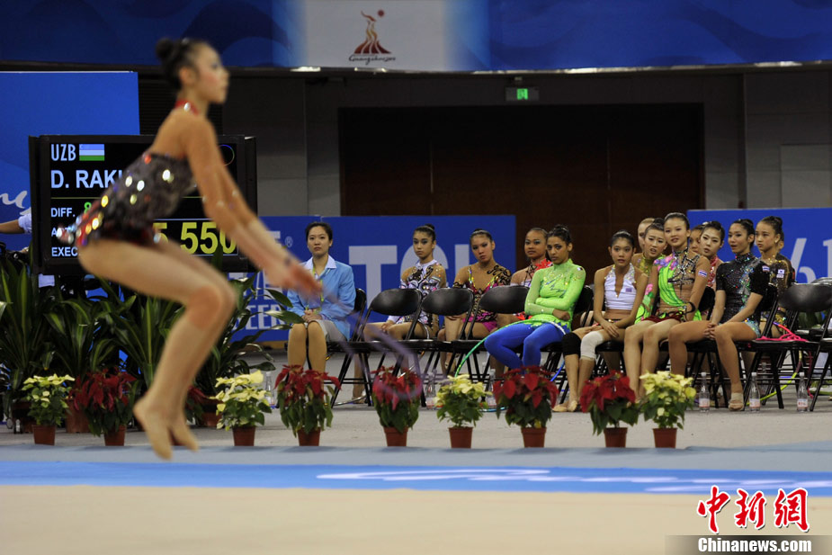 11月25日上午,广州亚运会艺术体操个人、团体决赛在亚运城体育馆开赛。图为中国选手在比赛中,场下的各国运动员聚精会神的观看对手表现。 中新社记者 金硕 摄