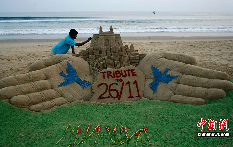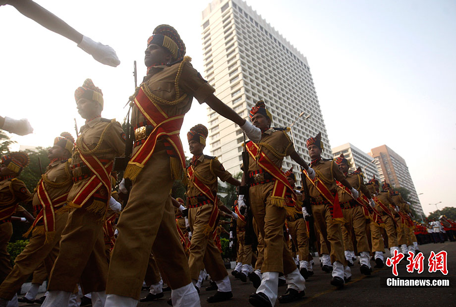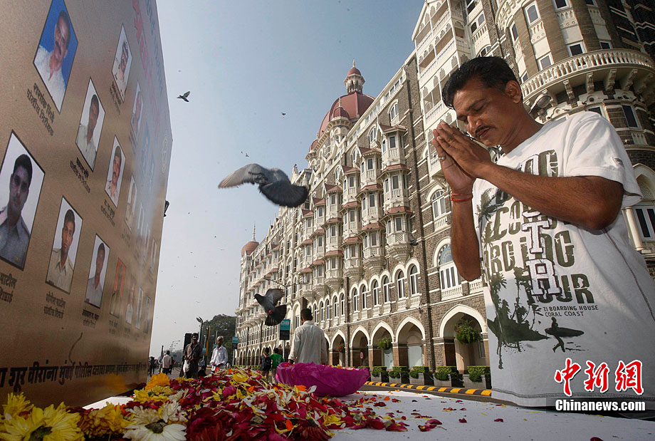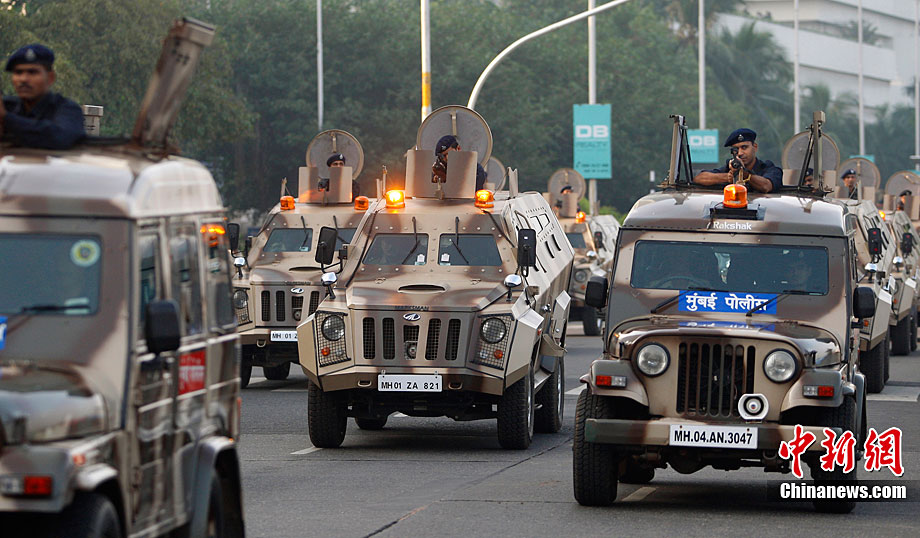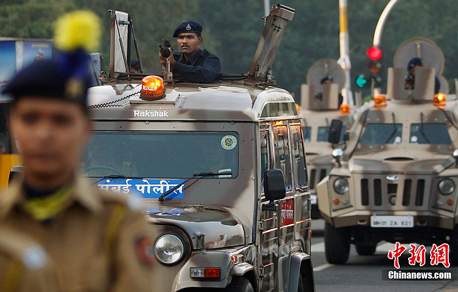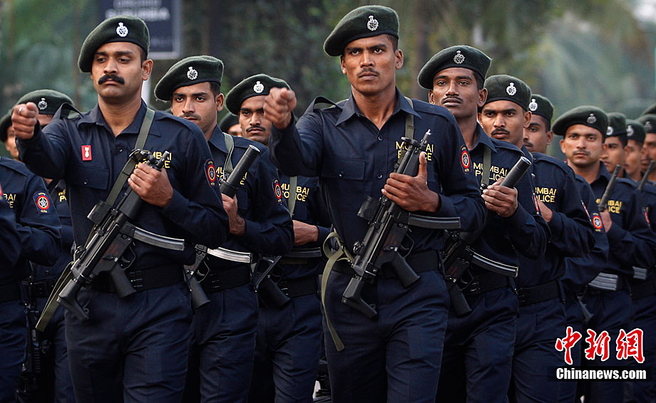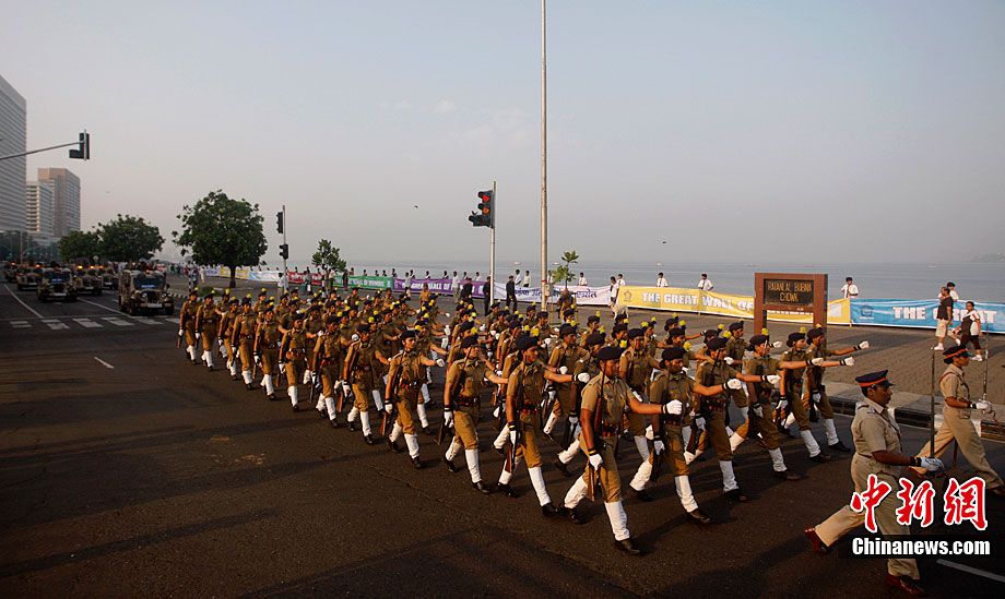 11月26日,警察在印度孟买的海滨大道上举行阅兵式,悼念恐怖袭击事件中的遇难者并表达反恐决心。2008年11月26日夜至29日,印度商业中心孟买的泰姬马哈酒店、奥贝罗伊酒店、犹太人中心以及孟买火车站等地遭遇连环恐怖袭击,造成至少195人死亡,大约300人受伤。