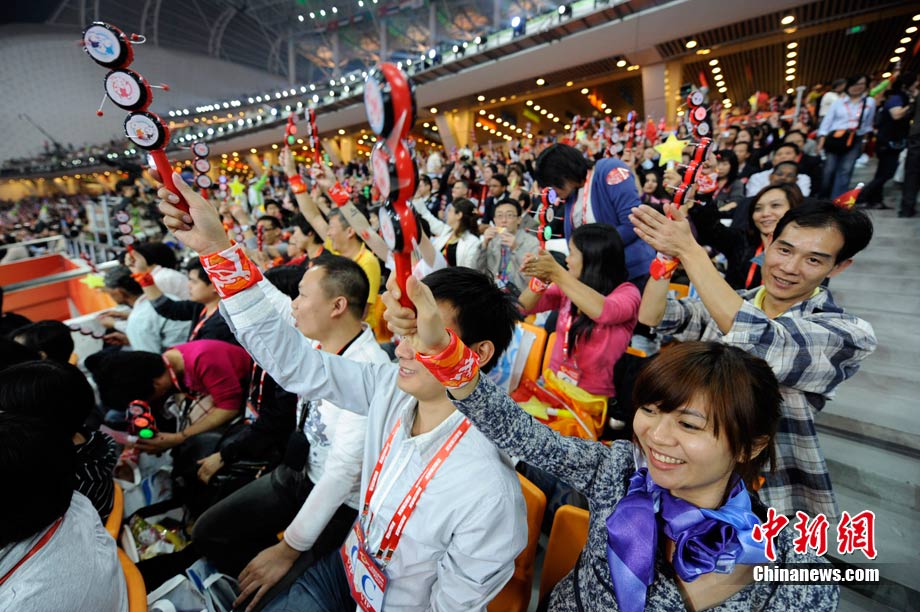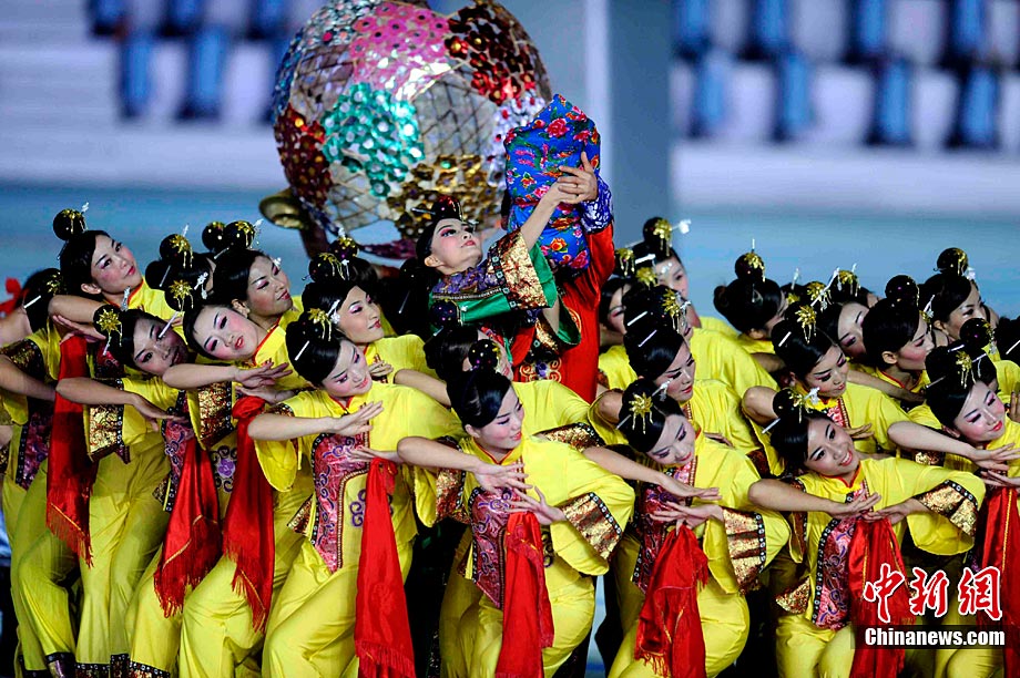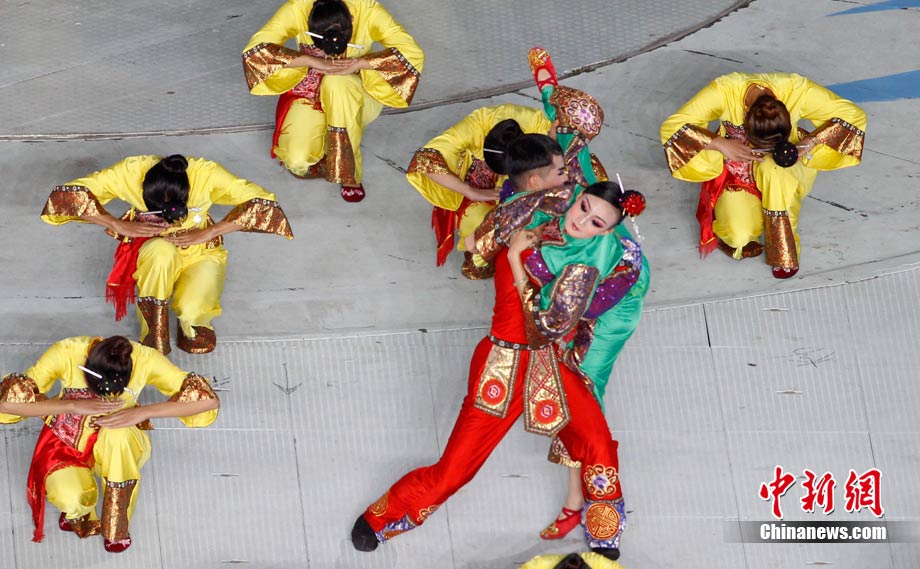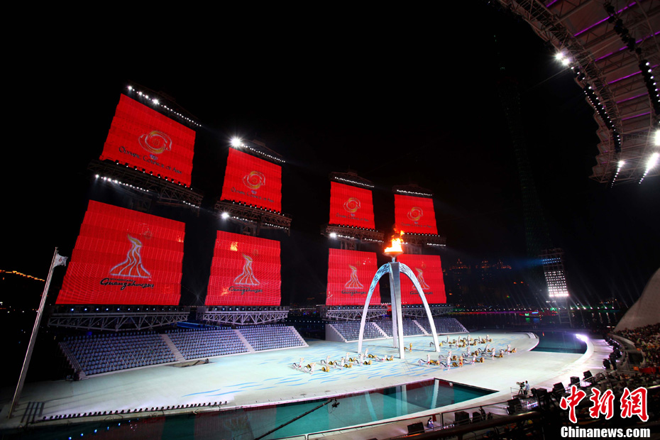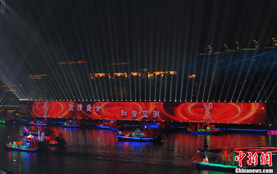 27日晚,广州亚运会闭幕式文艺演出开启,灯光电组合上演“海天一色”奇幻景象。中新社记者 张子扬 摄