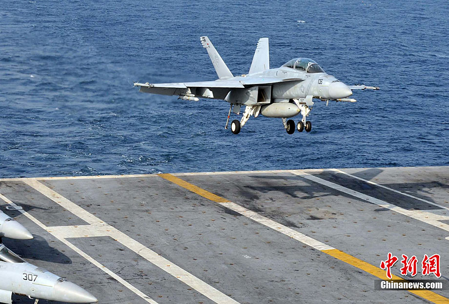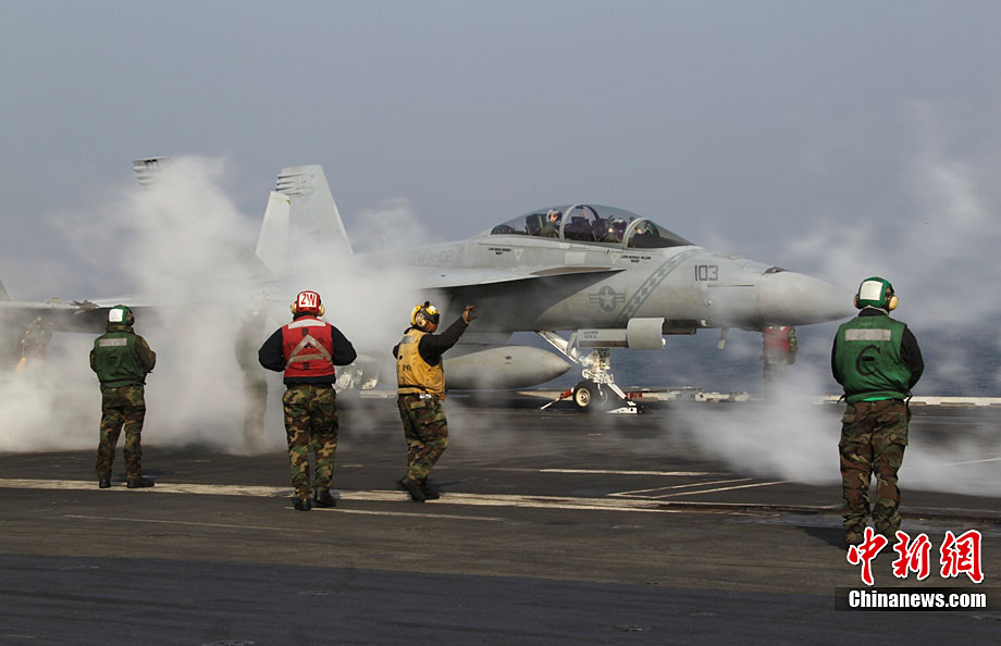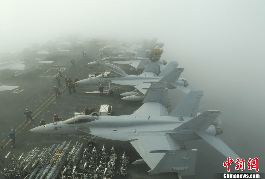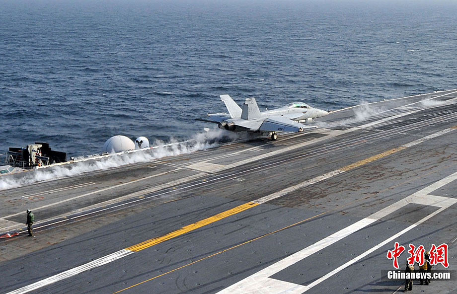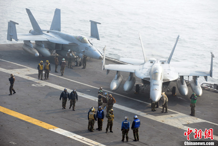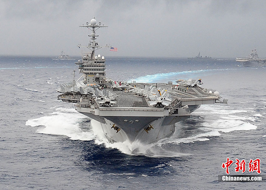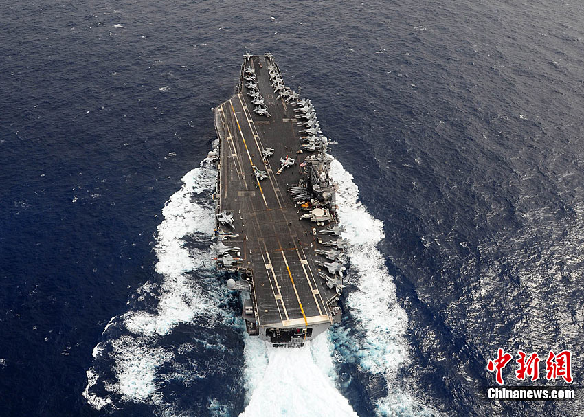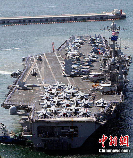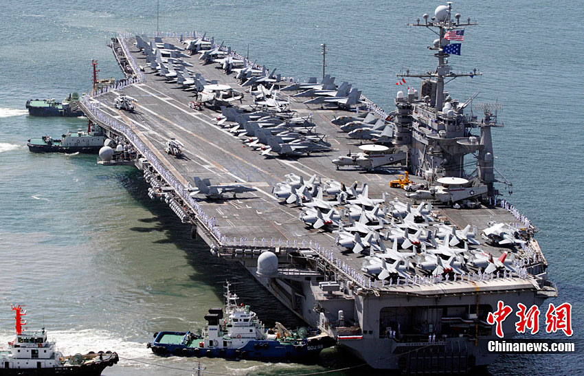 11月28日,韩美联合军事演习在黄海海域举行。美军派出“乔治·华盛顿”号航母、9600吨级巡洋舰及9750吨级驱逐舰参加演习。韩军也投入7600吨级“世宗大王”舰、两艘4500吨级驱逐舰以及巡逻舰、护航舰、战斗支援舰和反潜飞机等参加演习。图为11月17日,美国“乔治·华顿顿”号航母在日本冲绳附近演习。