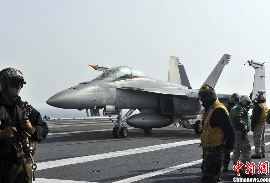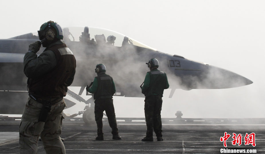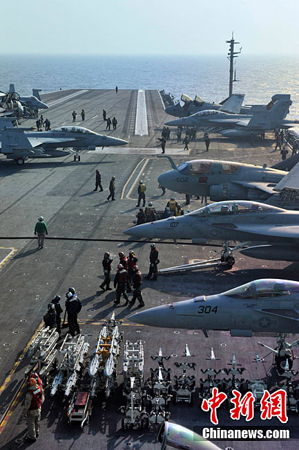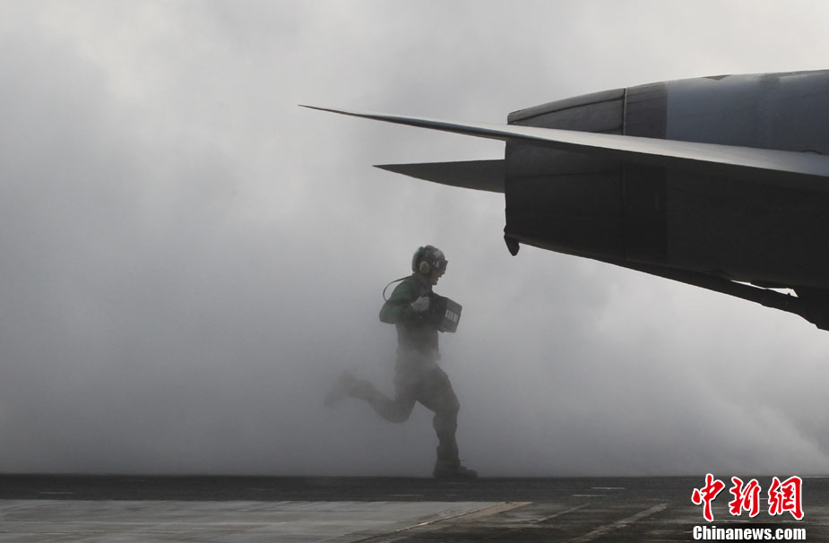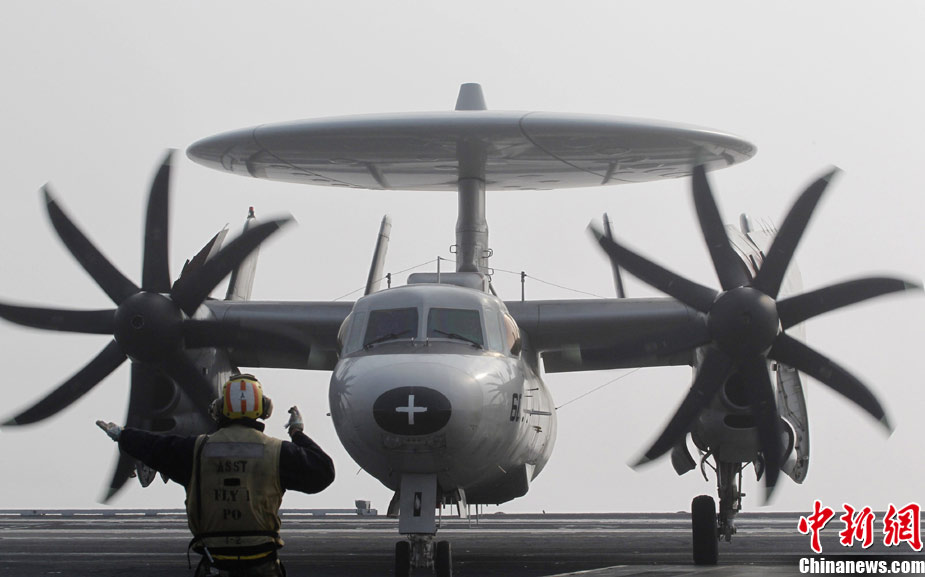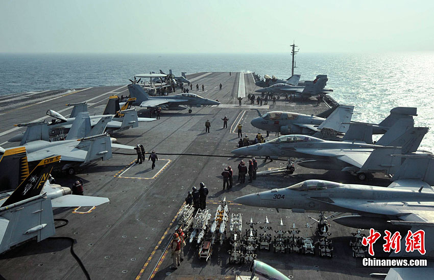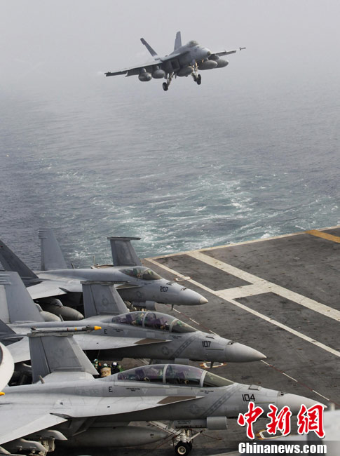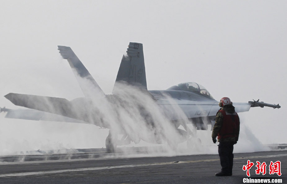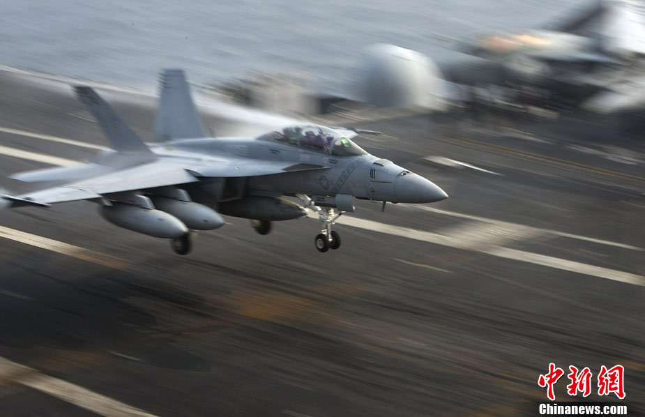 11月28日,韩美联合军事演习在黄海海域举行。美军派出“乔治·华盛顿”号航母、9600吨级巡洋舰及9750吨级驱逐舰参加演习。韩军也投入7600吨级“世宗大王”舰、两艘4500吨级驱逐舰以及巡逻舰、护航舰、战斗支援舰和反潜飞机等参加演习。图为11月17日,美国“乔治·华顿顿”号航母在日本冲绳附近演习。