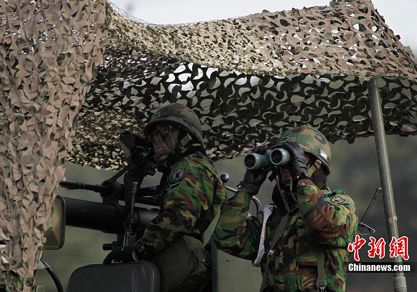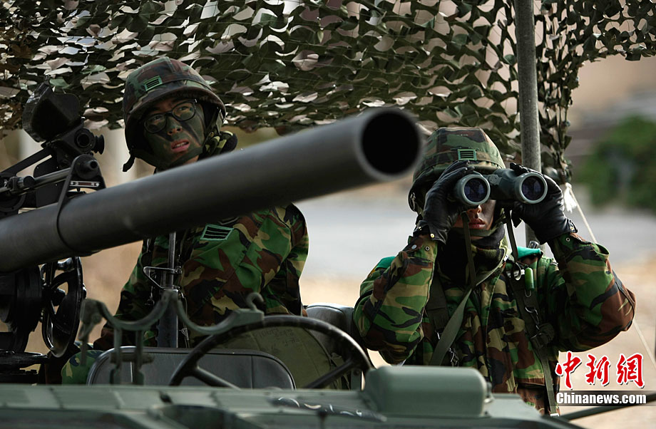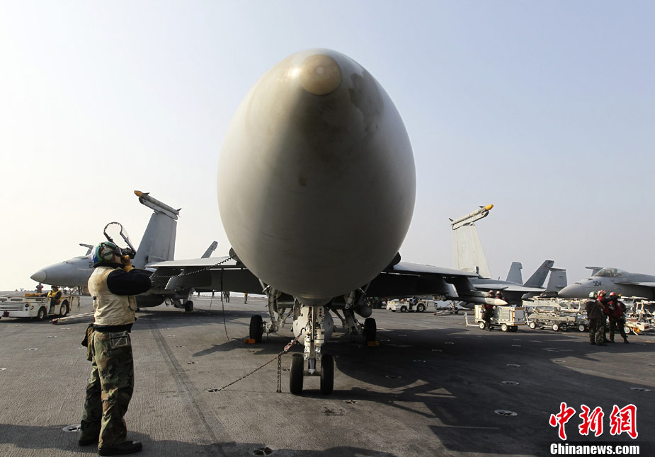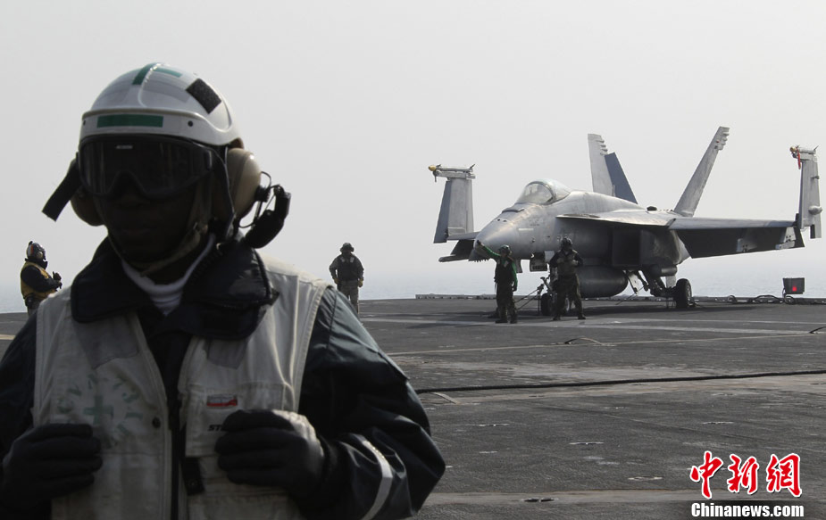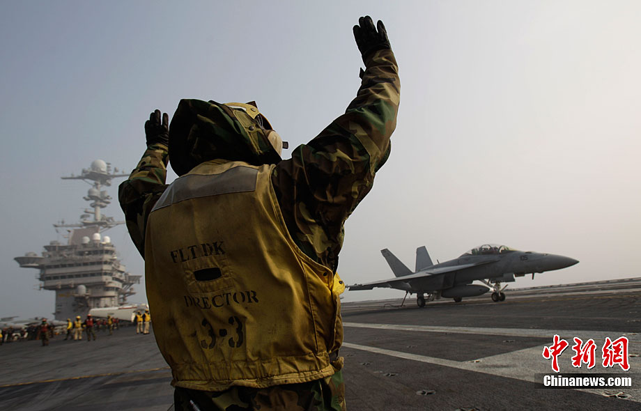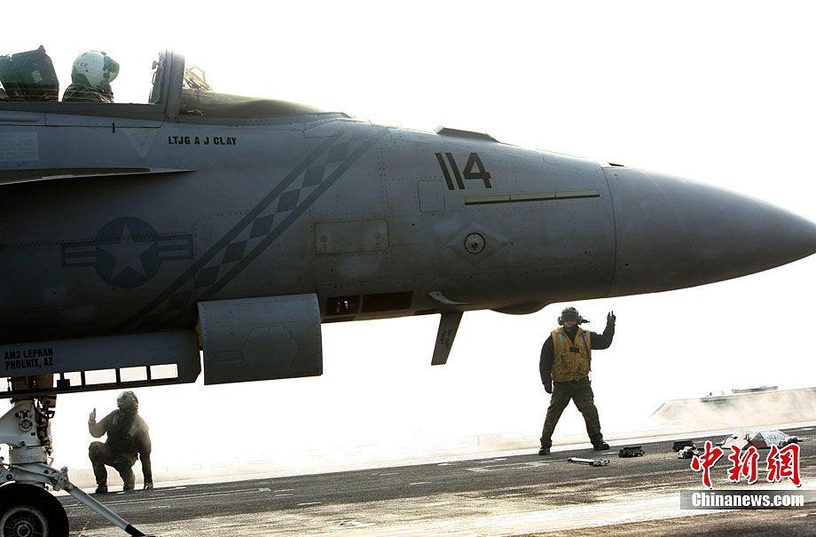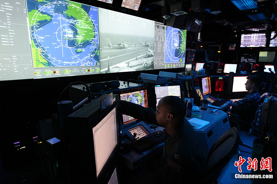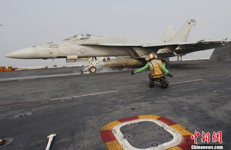 11月28日,韩美联合军事演习在黄海海域举行。美军派出“乔治·华盛顿”号航母、9600吨级巡洋舰及9750吨级驱逐舰参加演习。韩军也投入7600吨级“世宗大王”舰、两艘4500吨级驱逐舰以及巡逻舰、护航舰、战斗支援舰和反潜飞机等参加演习。图为11月17日,美国“乔治·华顿顿”号航母在日本冲绳附近演习。