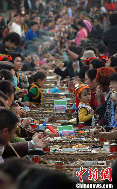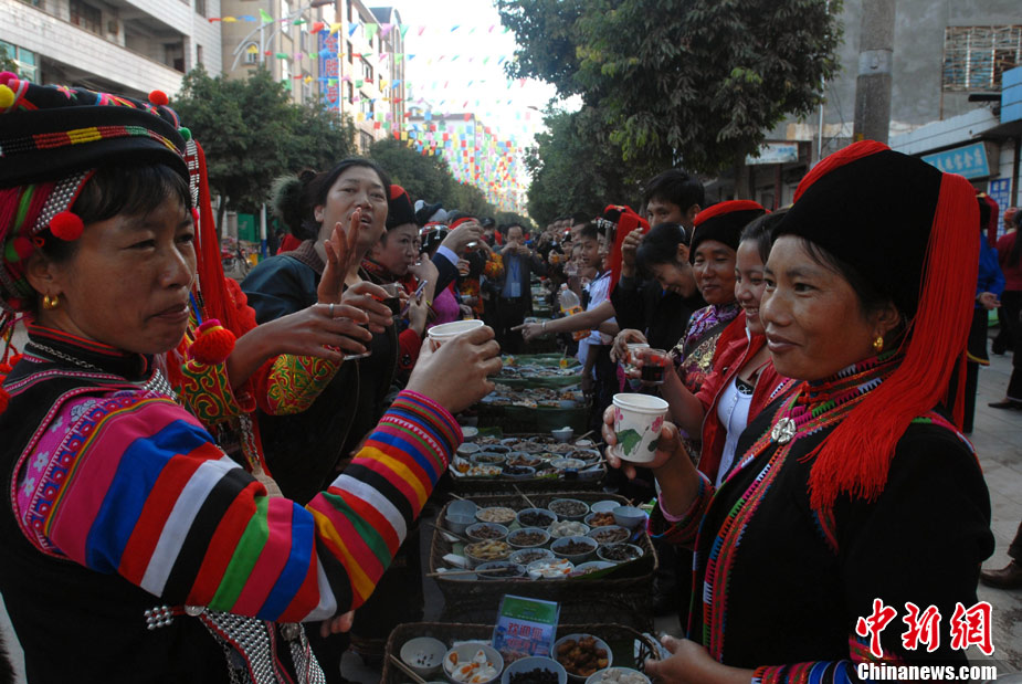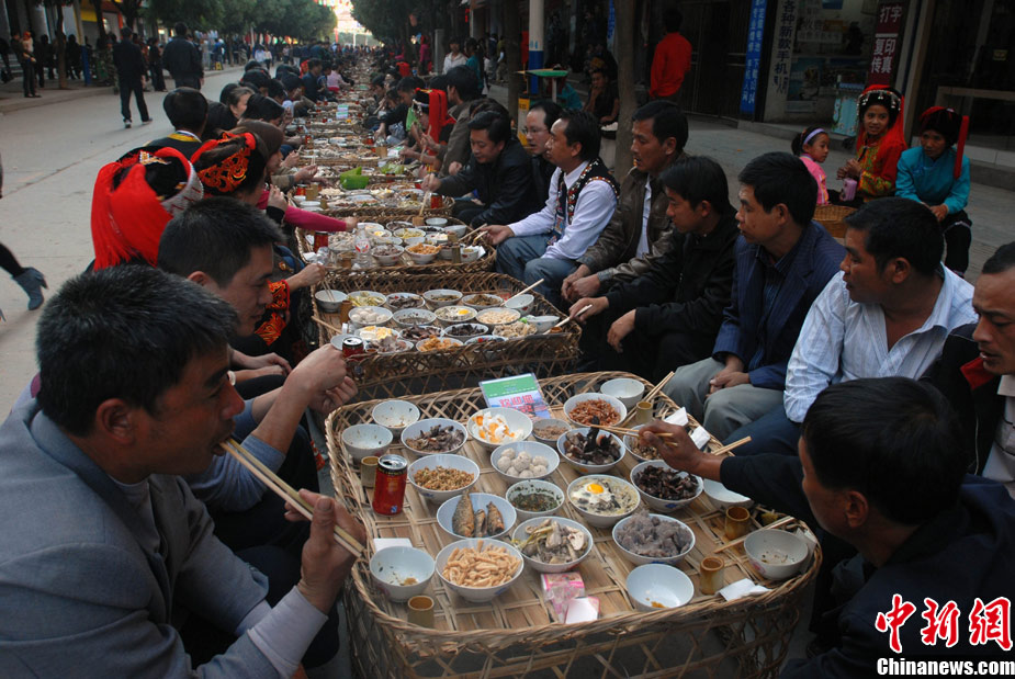 11月30日,有“天下第一宴”、“世界最长的宴席”美称的云南绿春哈尼族长街宴于在云南绿春县开宴,来自海内外上万名游客参加了今年的长街宴。此次长街宴共设1860桌全长近2000米。云南绿春哈尼长街宴于2008年以3050桌全长4000米被上海吉尼斯认证为“世界最长的宴席”。中新社发 任东 摄