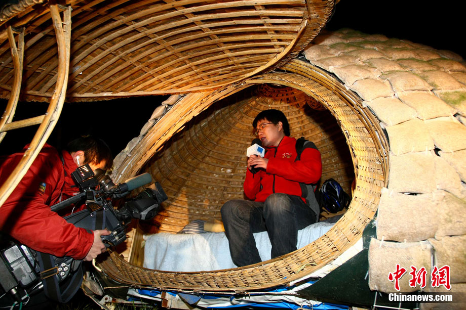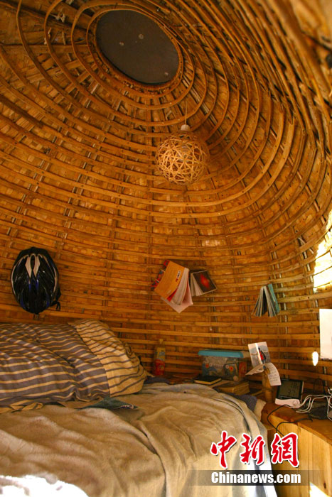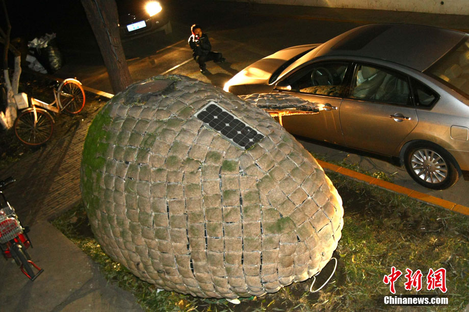 近日,来自湖南的24岁青年戴海飞在北京市海淀区成府路的一个大院里,搭起一个“蛋形”小屋,作为自己的蜗居。小屋两米多高,“蛋壳”上有一个椭圆形的小门,没有锁。小屋的下边装有轮子,可以挪动。小屋引起了多家媒体的高度关注,2日深夜有大批的记者来到小屋采访,而戴海飞却不知因何一直没有露面,直到深夜11点多,也没有回到小屋。中新社记者 富田 摄