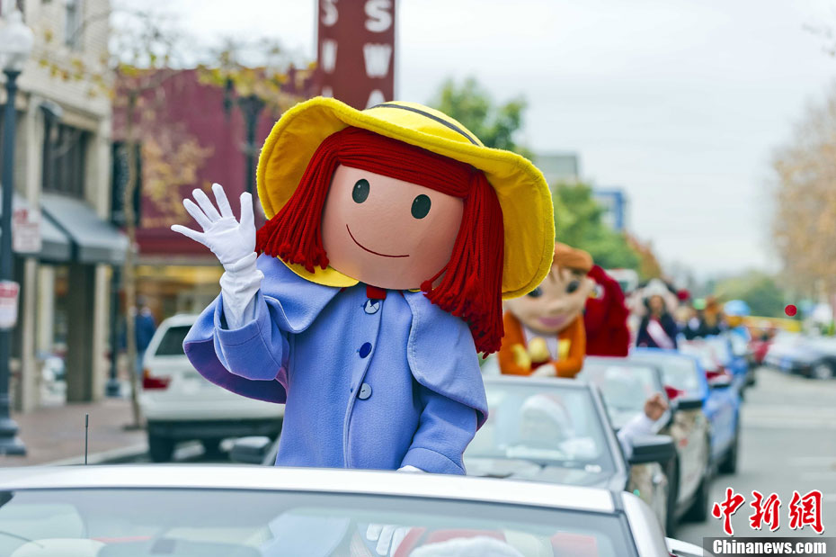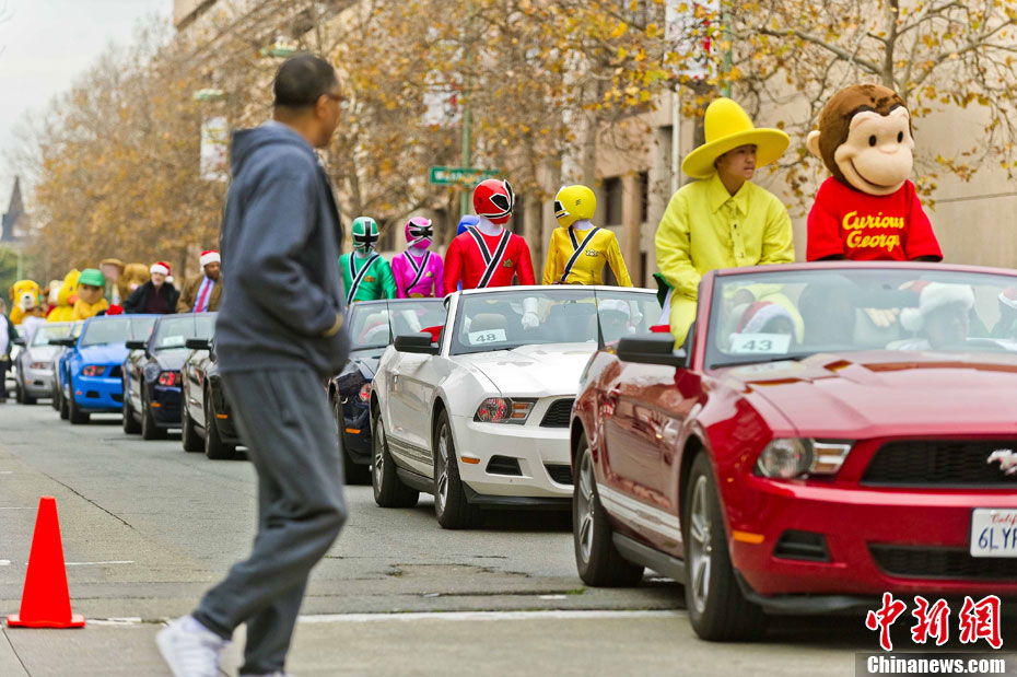 当地时间12月4日下午,美国加州奥克兰举行盛大儿童圣诞节游行,儿童动画片中的卡通人物是游行队伍的主角。图为2010年度全美亚裔小姐刘彧莞与卡通人物们。中新社发 陈钢 摄