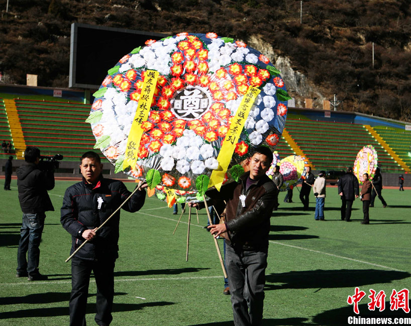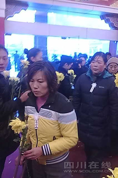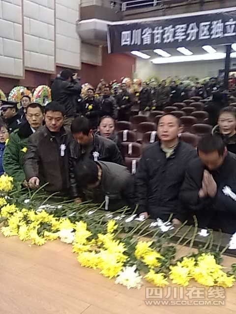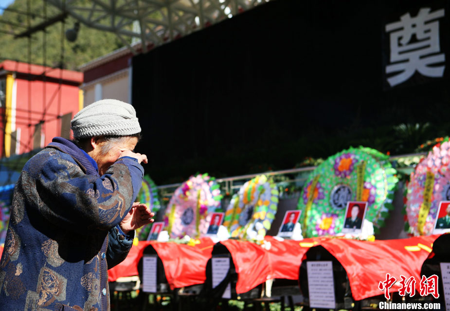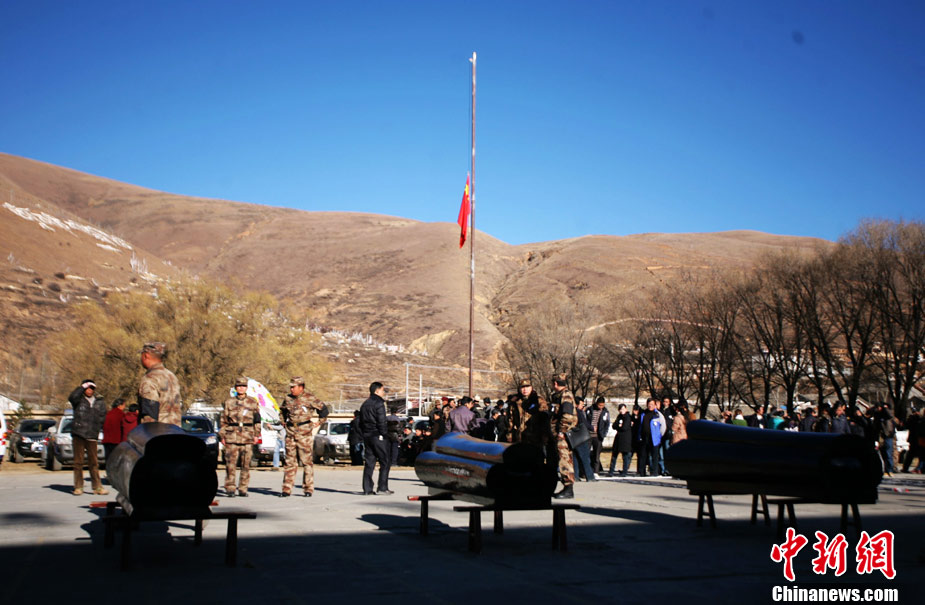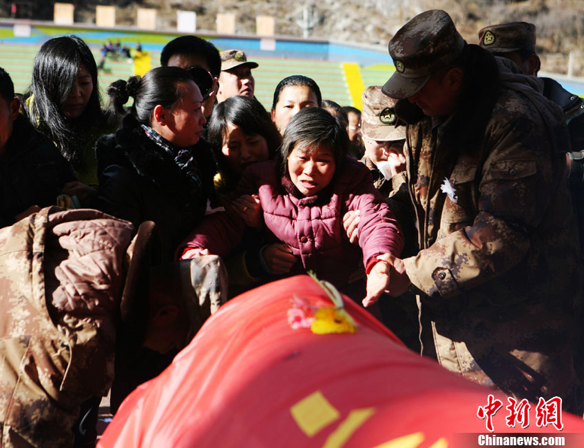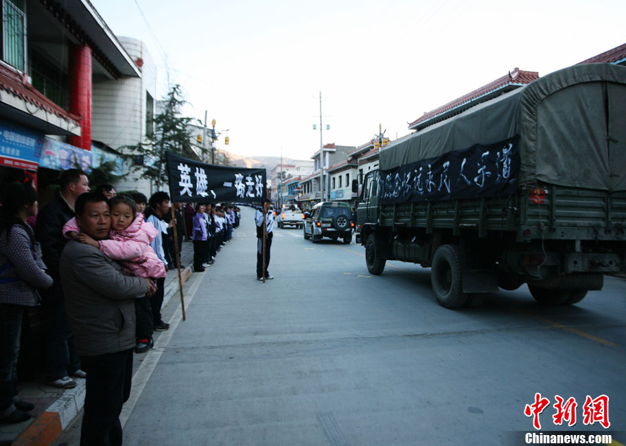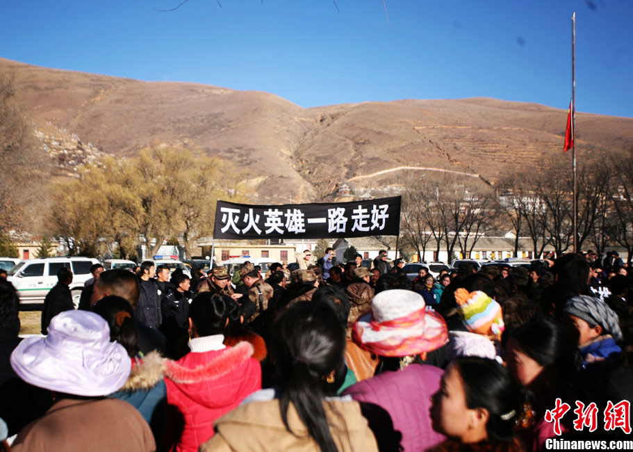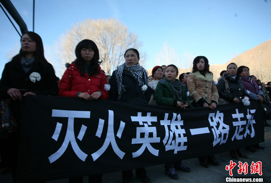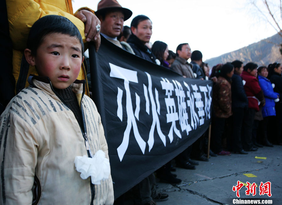 12月6日下午17时,在四川道孚救火中牺牲的15位英雄灵柩起运送往康定火化,上万民众胸带白花来到英雄路过的川藏线国道317线道孚城区段送别英雄。图为道孚县民众痛别英雄。 中新社发 刘忠俊 摄