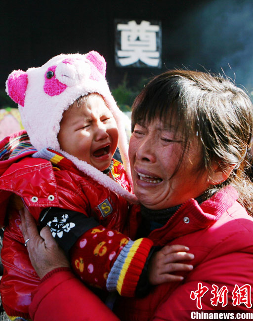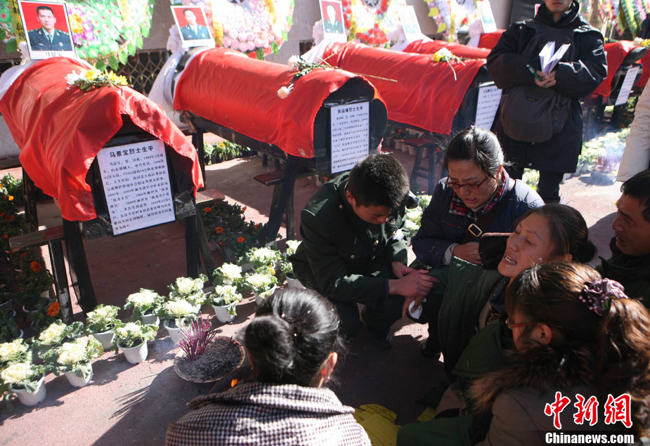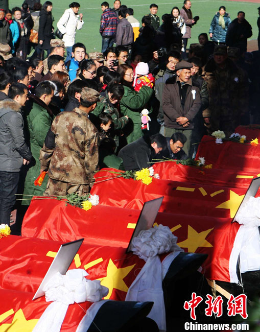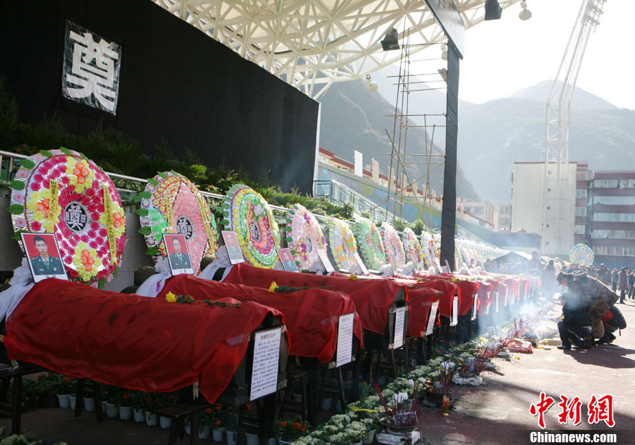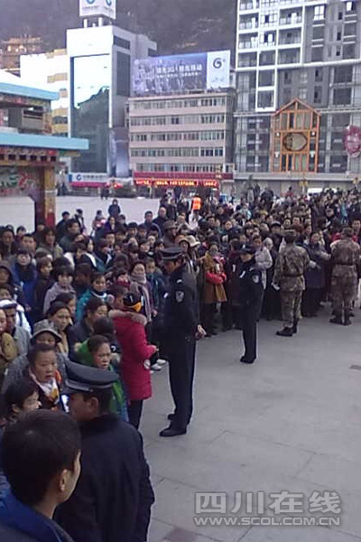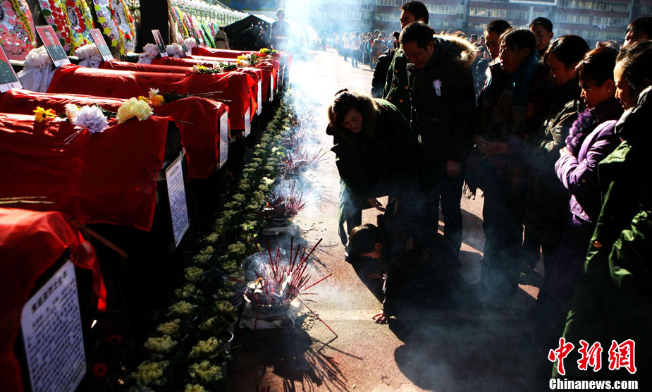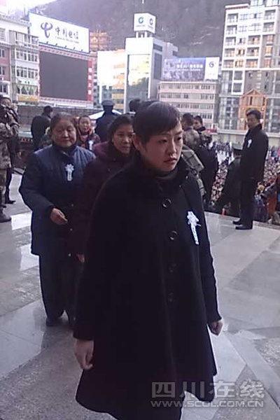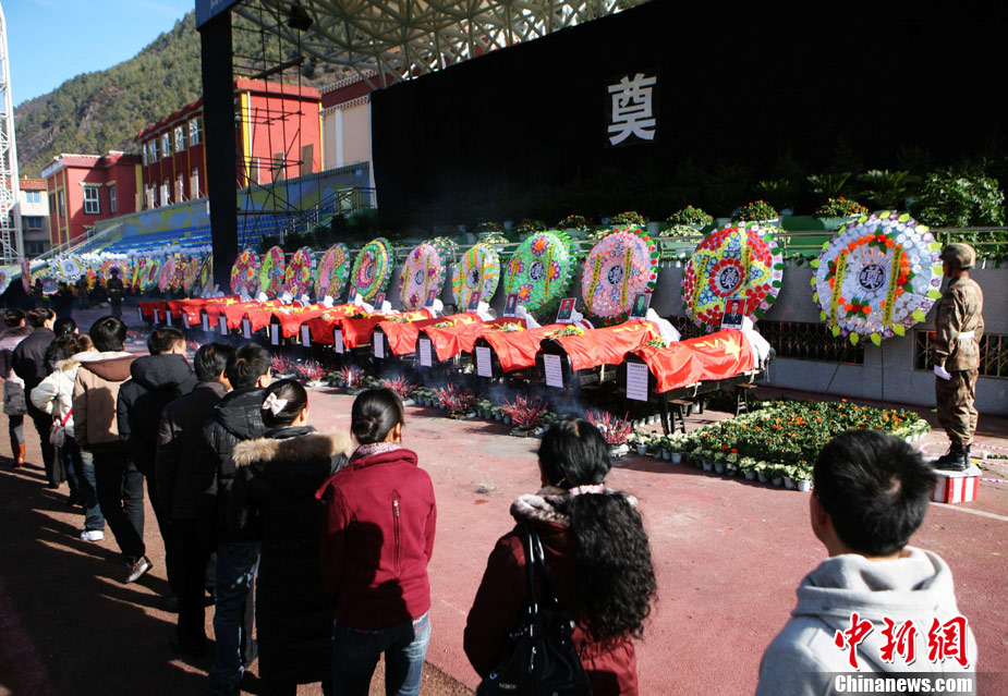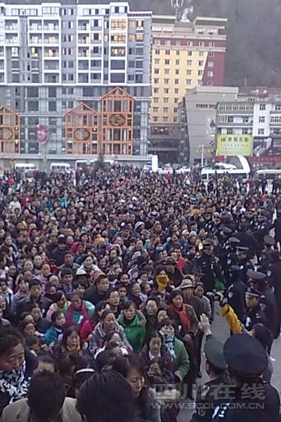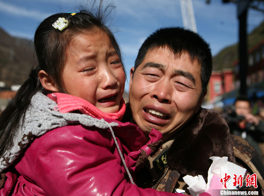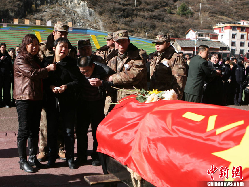 12月6日下午17时,在四川道孚救火中牺牲的15位英雄灵柩起运送往康定火化,上万民众胸带白花来到英雄路过的川藏线国道317线道孚城区段送别英雄。图为道孚县民众痛别英雄。 中新社发 刘忠俊 摄