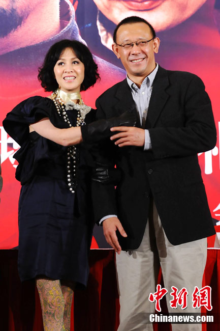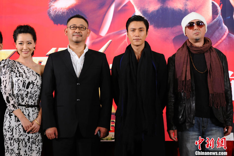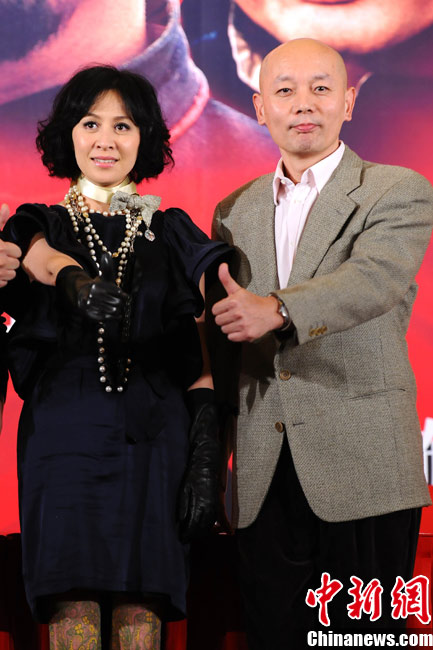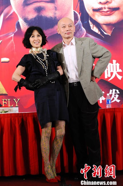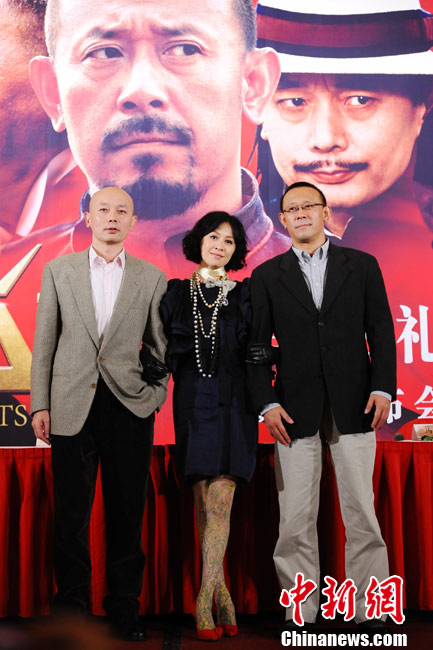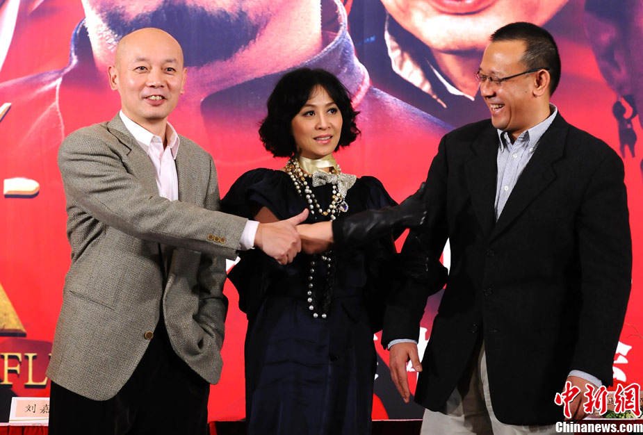 12月6日下午,姜文最新执导电影《让子弹飞》在北京召开首映发布会。姜文、葛优、刘嘉玲、陈坤、姜武、邵兵、廖凡、姚橹、周韵等众主创汇聚一堂。将于12月16日震撼上映的《让子弹飞》是葛优、姜文两大内地华语影坛传奇男星15年来的首度合作,更有华语顶级巨星周润发鼎力加盟,可谓集结了当下华语电影的顶级阵容。发布会上,姜文姗姗来迟,刘嘉玲性感纹身丝袜相当惊艳。葛优、刘嘉玲大方摆起POSE给媒体拍照,表情多变十分抢镜,不过两人也不忘向姜文竖起大拇指力挺。 中新社记者 李学仕 摄