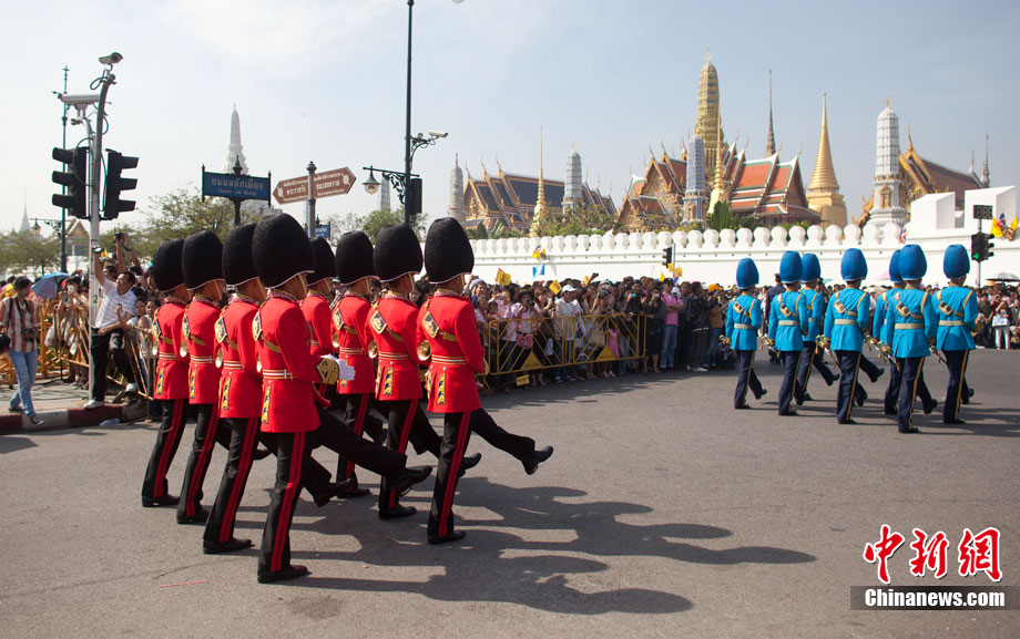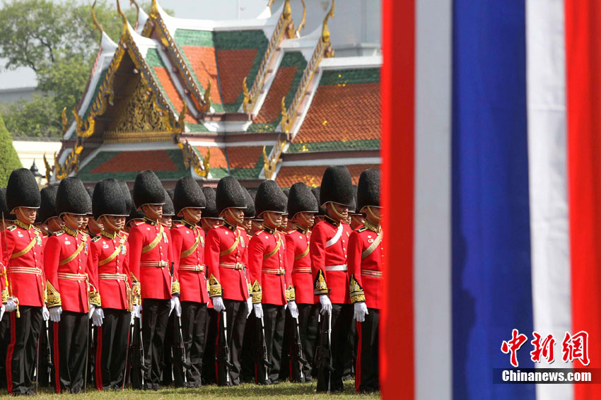 泰国皇家卫队士兵着彩装游行为国王庆生