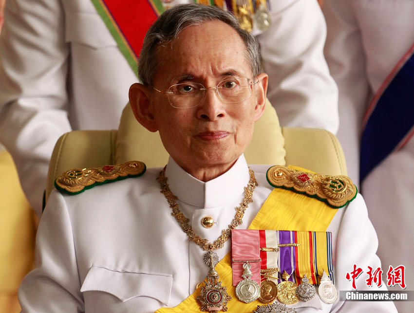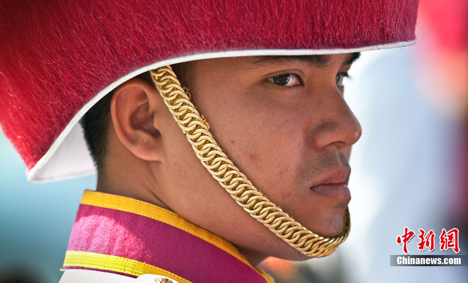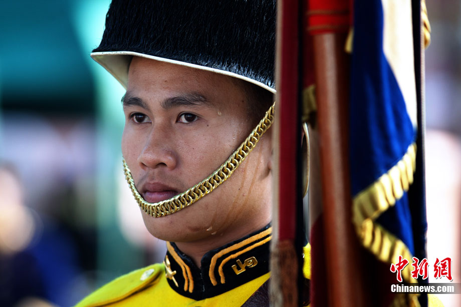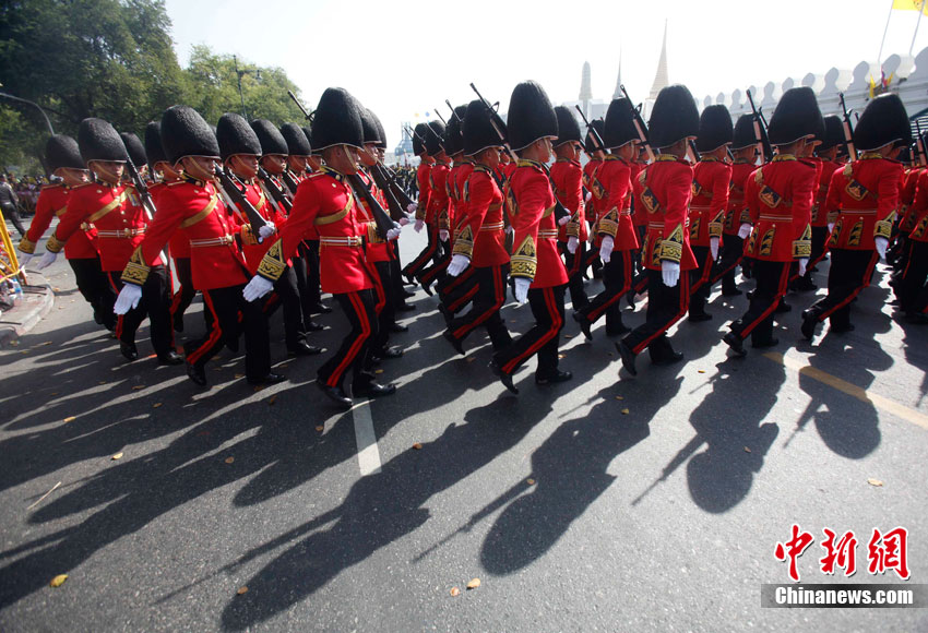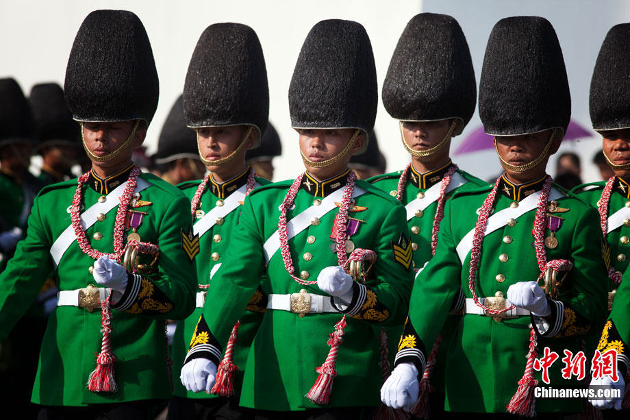 当地时间12月5日,泰国各界齐聚曼谷市中心的大王宫,庆祝泰王普密蓬83岁大寿。泰国皇家卫队士兵身着红、绿、黑、兰等各种颜色的军服进行游行,为泰王庆祝生日。