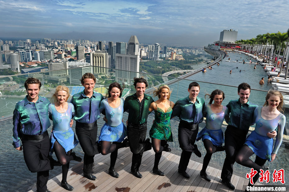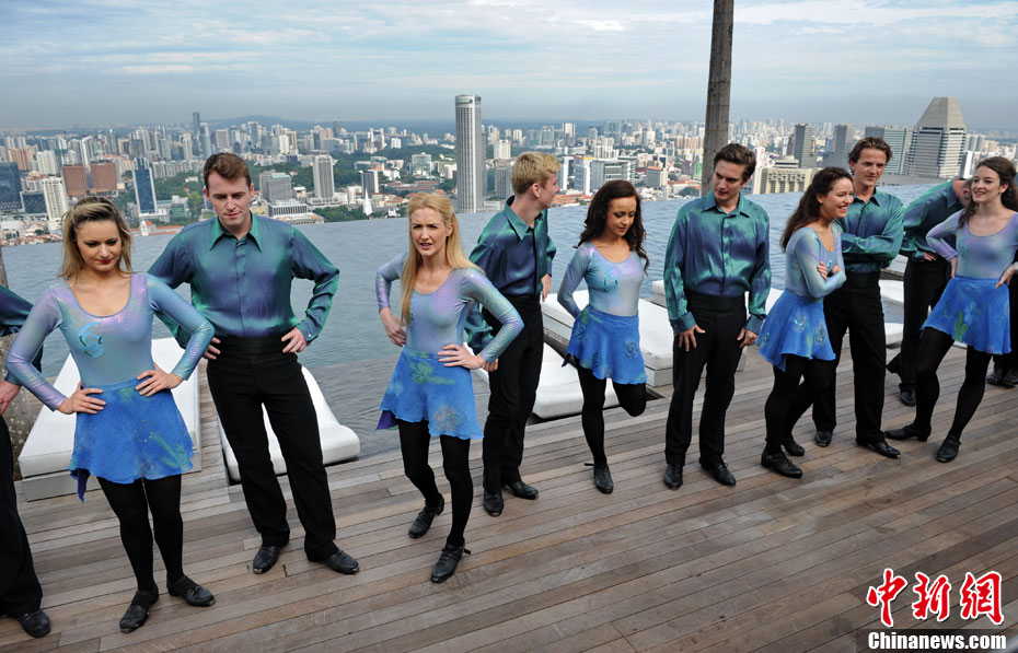 图为大河之舞爱尔兰舞蹈团成员在新加坡滨海湾金沙酒店的空中花园合影。
