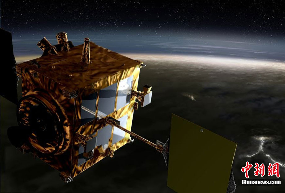 2010年5月发射升空的日本金星探测器“拂晓”号于日本时间12月7日上午抵达距离金星最近处,并进行为进入环绕轨道的引擎反向喷射。图为日本金星探测器“拂晓”号抵达金星上空的模拟图。