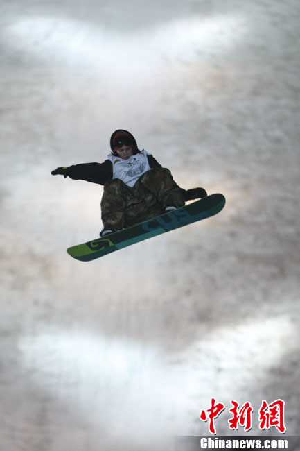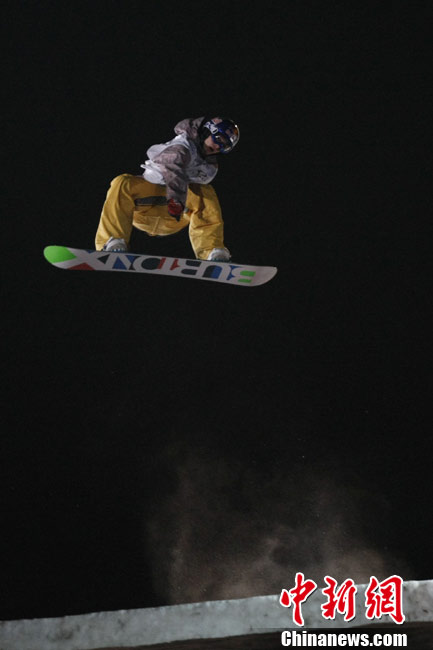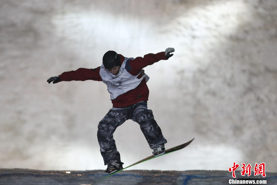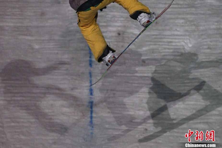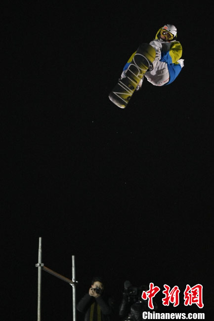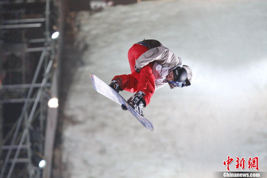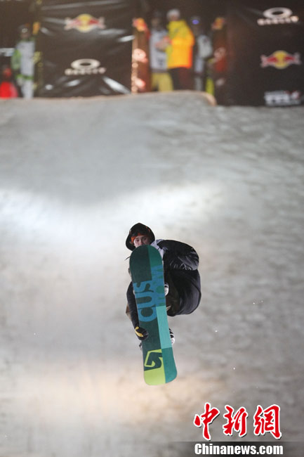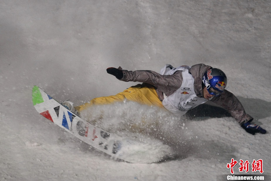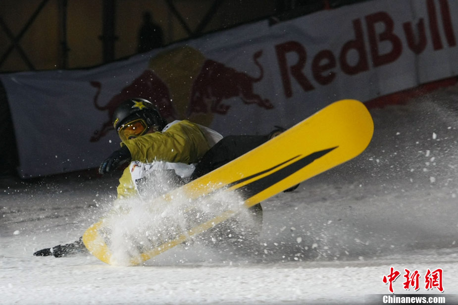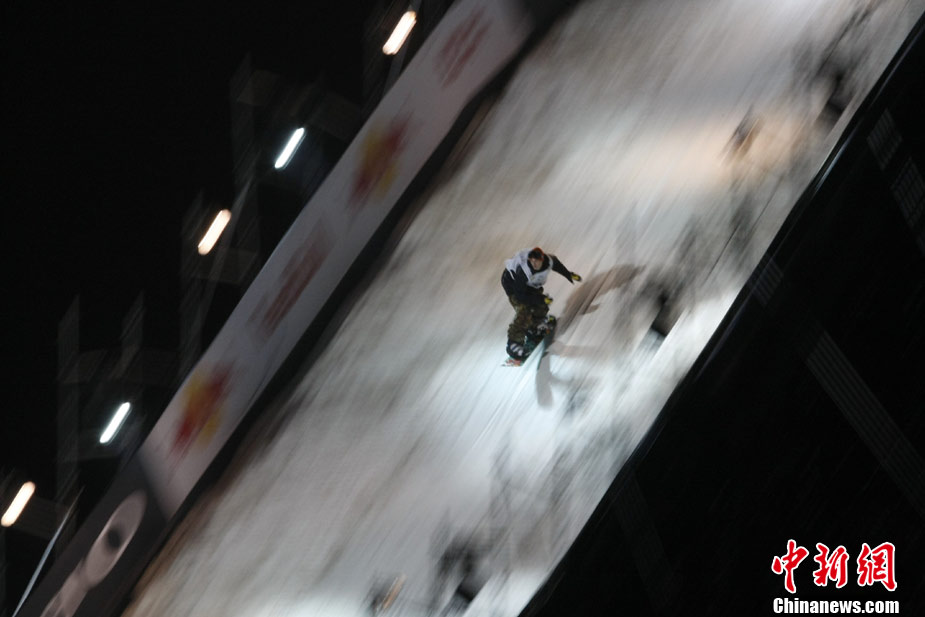 12月4日晚,“沸雪”(AIR & STYLE)世界单板滑雪北京赛在奥体中心震撼上演,无与伦比的视觉冲击和感官刺激让全场上万名观众热血沸腾,也为“红牛单板狂欢季”奏响了华丽序曲。中新社记者 盛佳鹏 摄