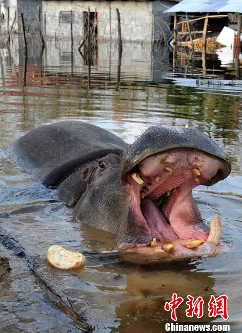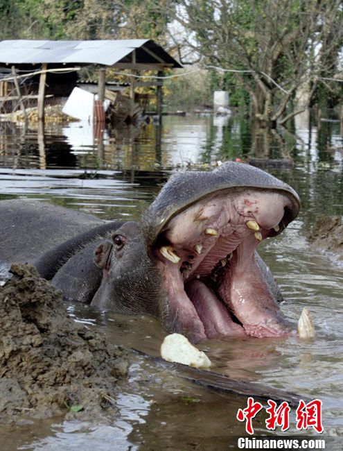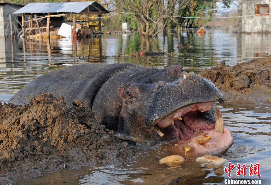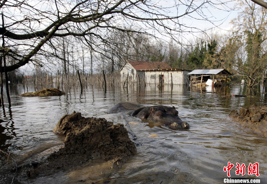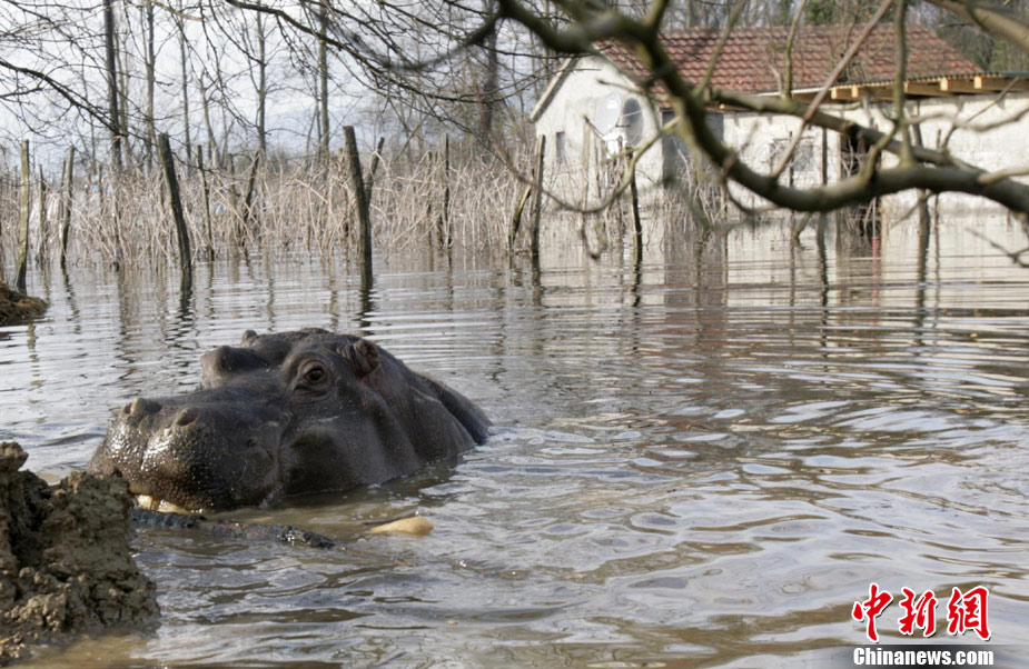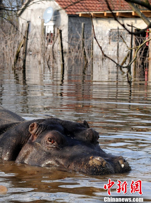 巴尔干半岛西部连日来频遭大雨侵袭,造成波斯尼亚和黑塞哥维那、塞尔维亚、黑山和阿尔巴尼亚的许多地区洪水泛滥,数千人被迫撤离家园。图为6日,在黑山的普拉夫尼察,一头从动物园中逃出的河马在洪水中游泳。