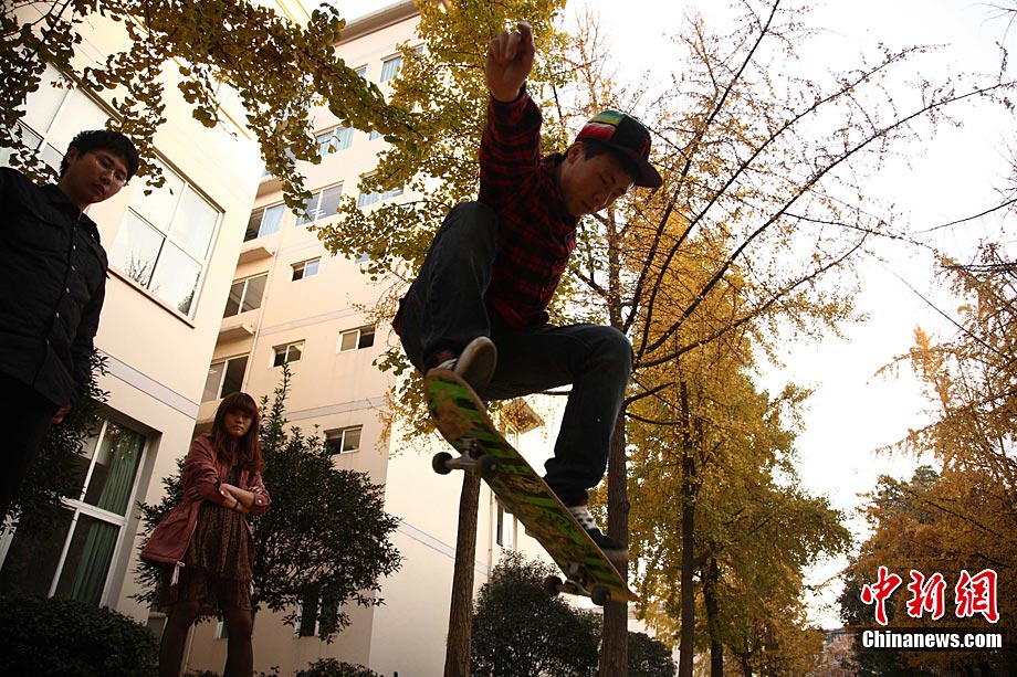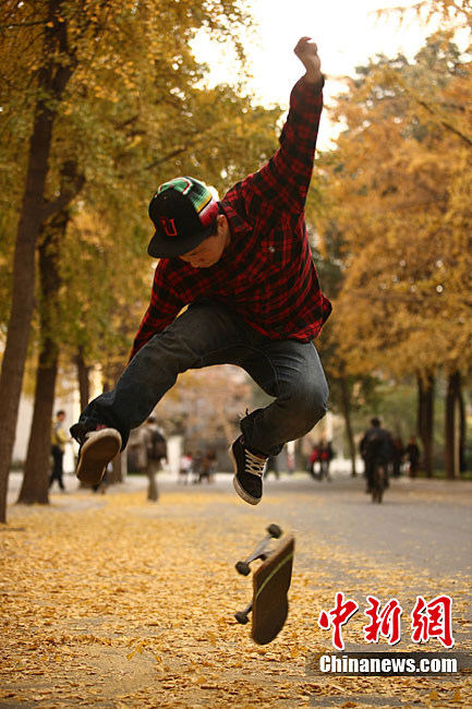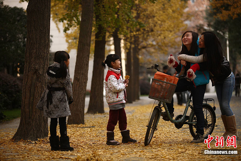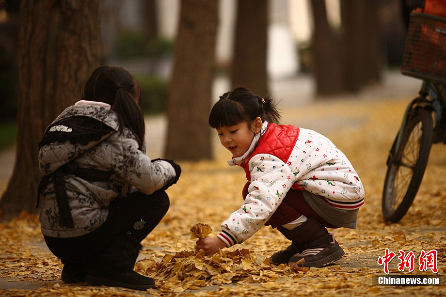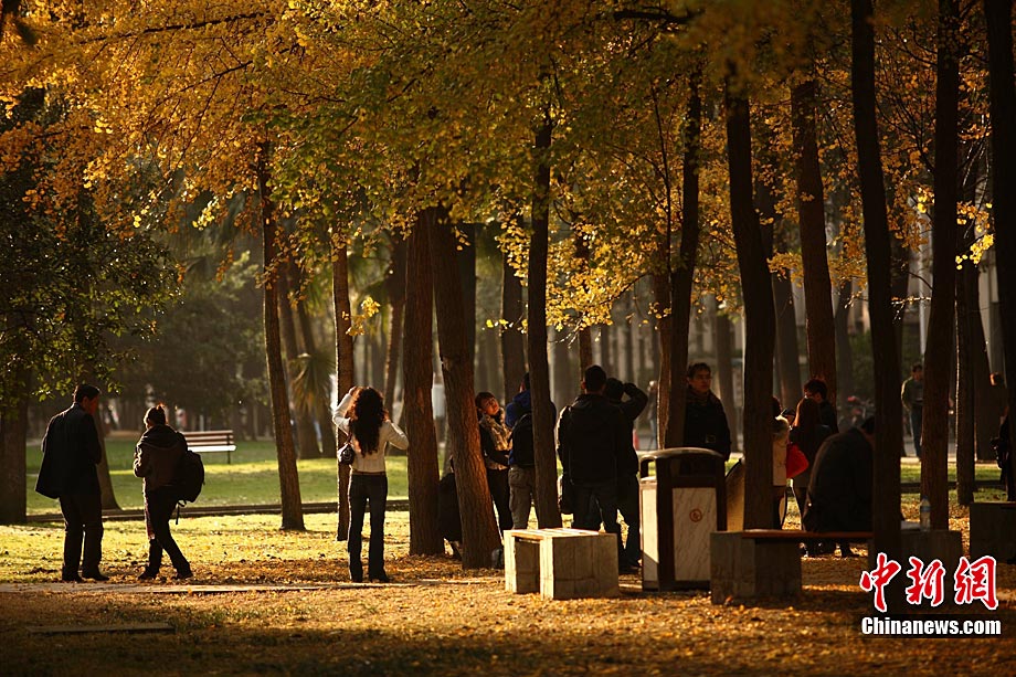 银杏树作为成都市的市树,每年11月底到12月初是市民观赏银杏的最佳时期,面对市民发出的“保留银杏落叶景观”呼声,成都市环卫部门于2009年对部分街道的银杏落叶首次采取“只捡不扫”的措施,2010年,成都环卫部门继续采用了这一人性化措施,将银杏落叶景观长时间留给市民。中新社发 张浪 摄